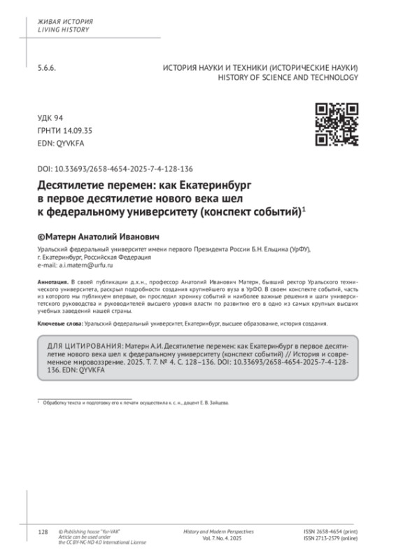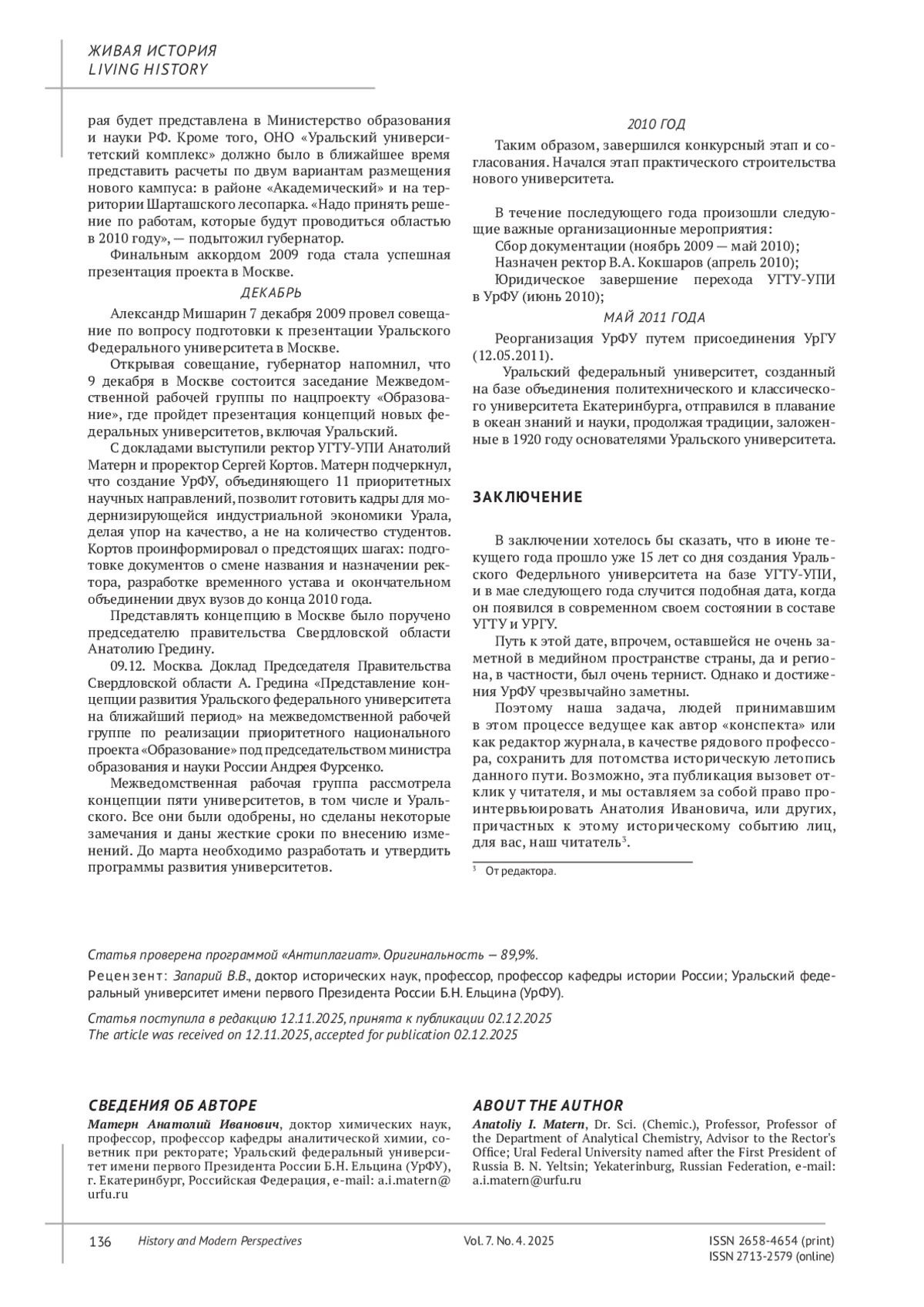 В своей публикации д. х. н., профессор Анатолий Иванович Матерн, бывший ректор Уральского технического университета, раскрыл подробности создания крупнейшего вуза в УрФО. В своем конспекте событий, часть из которого мы публикуем впервые, он проследил хронику событий и наиболее важные решения и шаги университетского руководства и руководителей высшего уровня власти по развитию его в одно из самых крупных высших учебных заведений нашей страны.