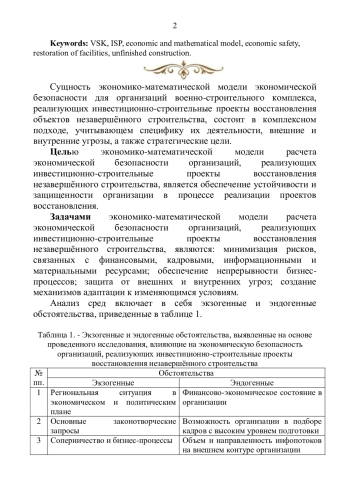 Сущность экономико-математической модели экономической безопасности для организаций военно-строительного комплекса, реализующих инвестиционно-строительные проекты восстановления объектов незавершённого строительства, состоит в комплексном подходе, учитывающем специфику их деятельности, внешние и внутренние угрозы, а также стратегические цели.