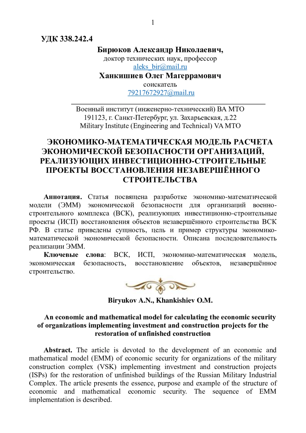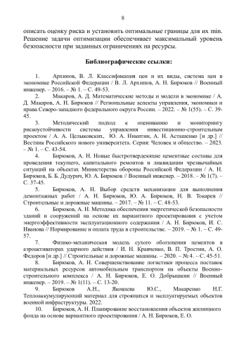 14. Бирюков, Д.В. Обоснование организационно - технических решений при восстановлении и реконструкции объектов незавершенного строительства военной инфраструктуры / Д.В. Бирюков, А.В. Бондарев // Актуальные проблемы естественных и технических наук: Сборник статей межвузовской научно - практической конференции, Санкт-Петербург, 18 октября 2024 года. - Санкт-Петербург: 2024. - С. 19-27. EDN: KXRSRB