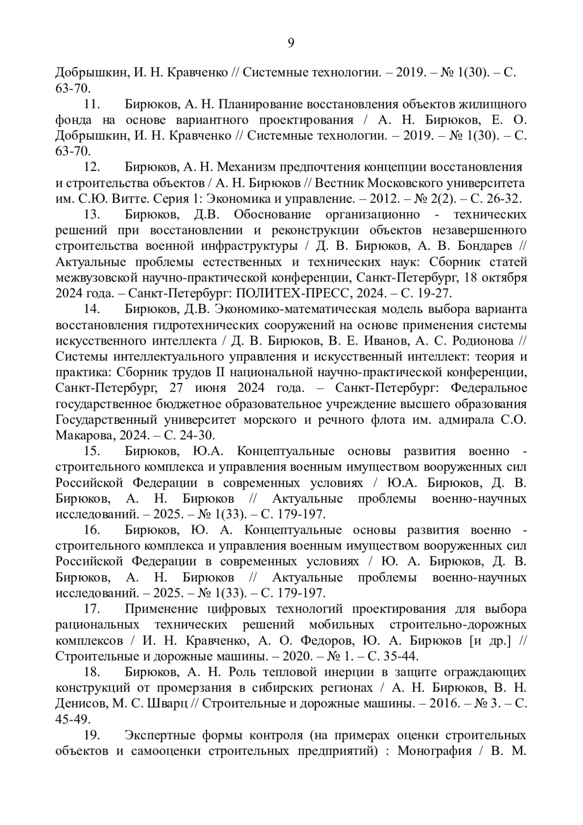 16. Бирюков Ю.А. Концептуальные основы развития военно - строительного комплекса и управления военным имуществом вооруженных сил Российской Федерации в современных условиях / Ю.А. Бирюков, Д.В. Бирюков, А.Н. Бирюков // Актуальные проблемы военно - научных исследований. - 2025. - № 1(33). - С. 179-197. EDN: XZZTWU