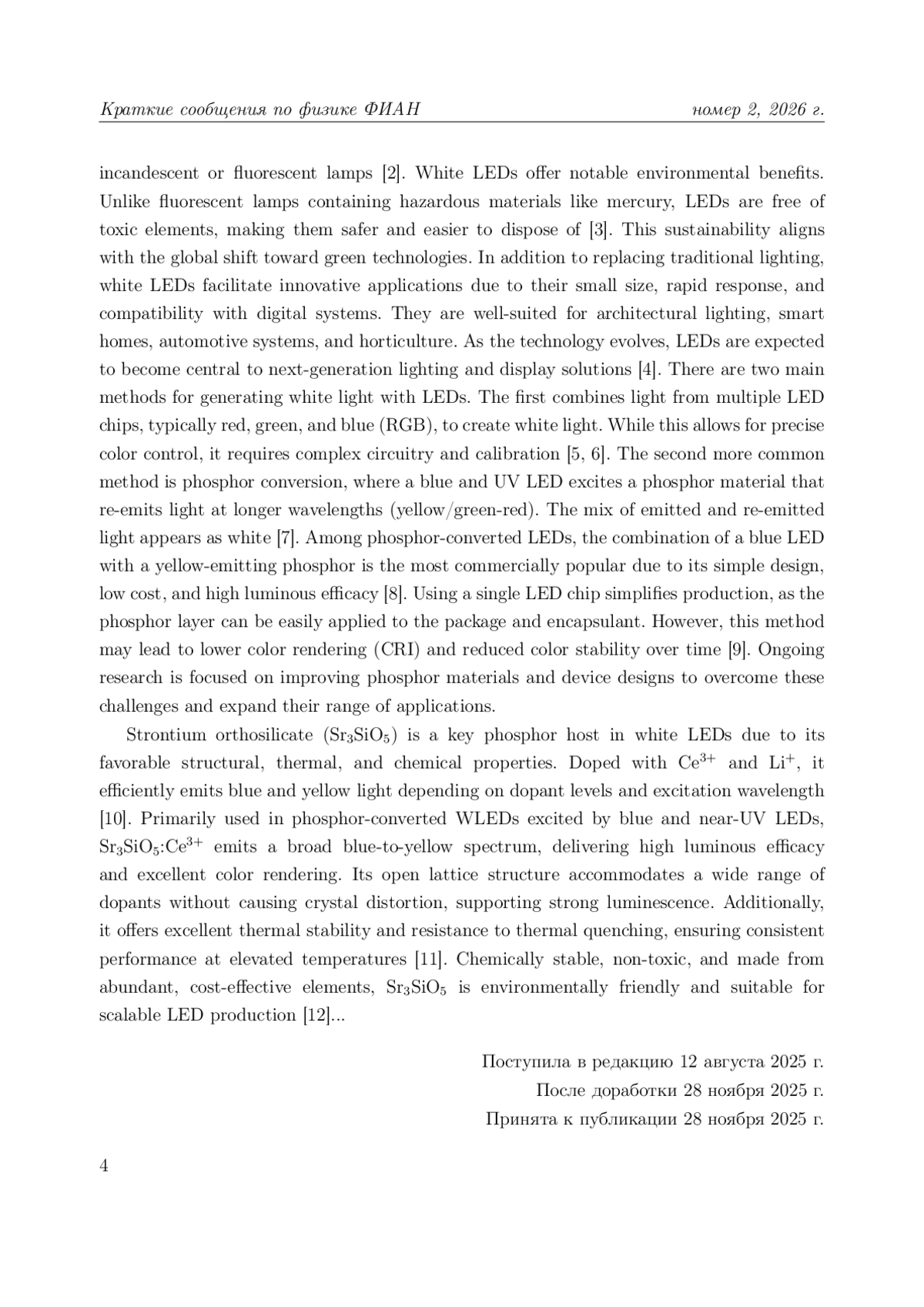 1. Доу К., Сонг З., Лю Ц. Разработка люминофоров, легированных Ce3+/Eu2+, для полноспектрального освещения на основе фиолетовых чипов. J. Mater. Chem. C, 2024, том 12, стр. 11209–11241.