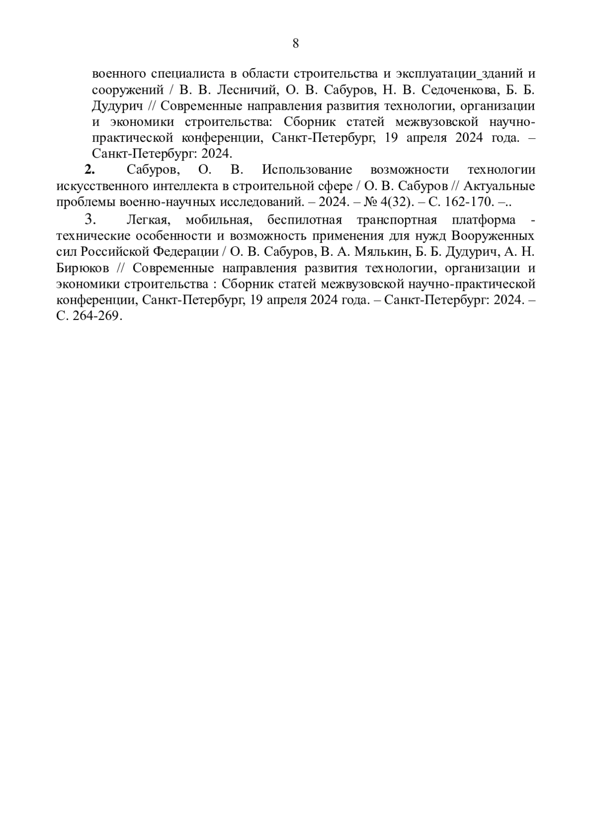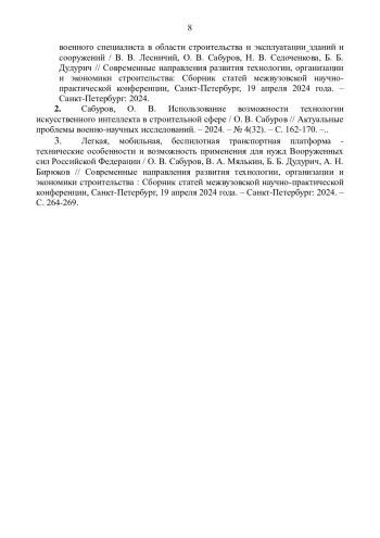 2. Перспективы применения информационных технологий в формировании эффективной информационно - образовательной среды для подготовки военного специалиста в области строительства и эксплуатации зданий и сооружений / В.В. Лесничий, О.В. Сабуров, Н.В. Седоченкова, Б.Б. Дудурич // Современные направления развития технологии, организации и экономики строительства: Сборник статей межвузовской научно - практической конференции, Санкт-Петербург, 19 апреля 2024 года. - Санкт-Петербург: 2024. EDN: FETCYC