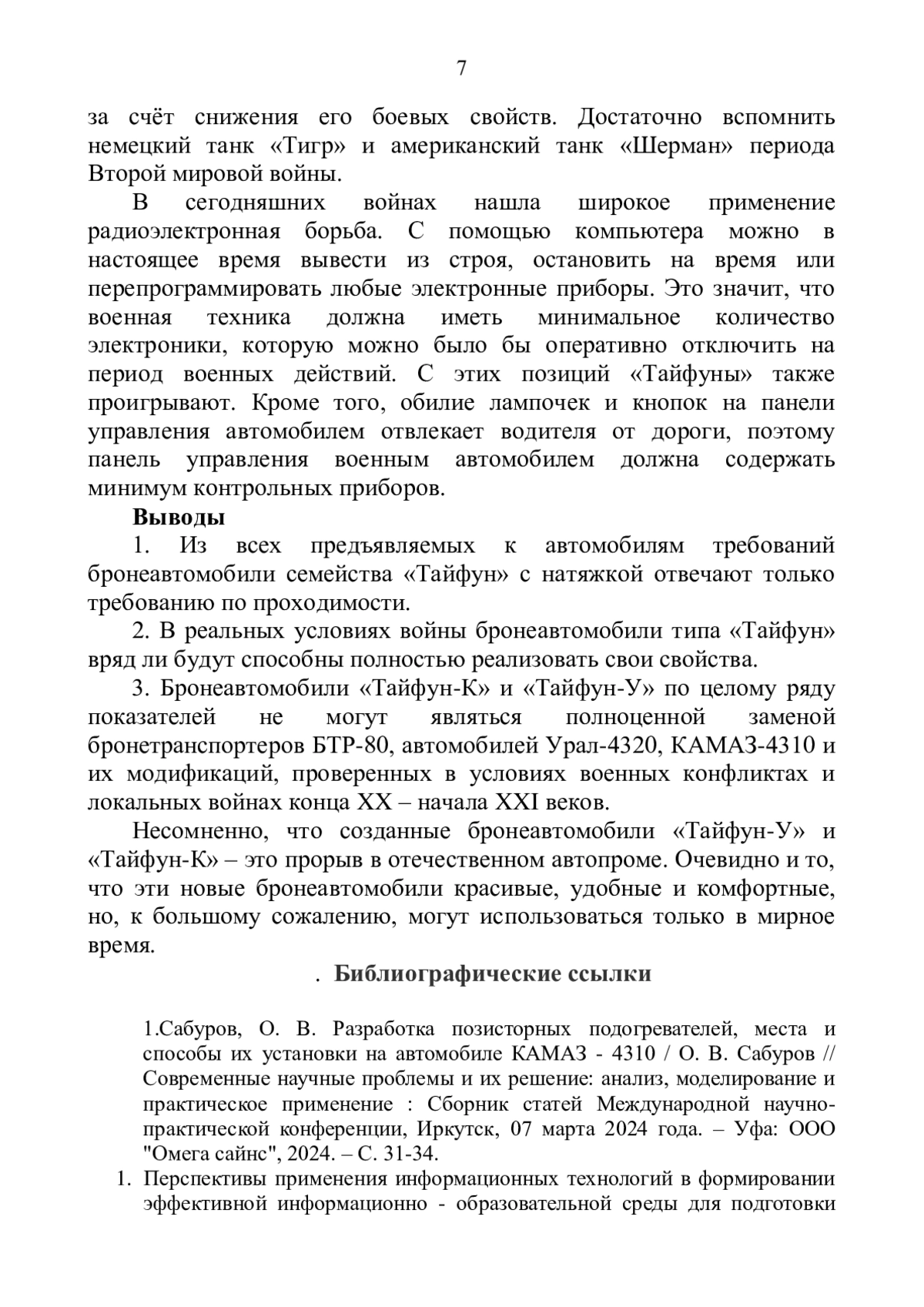 1. Сабуров, О. В. Разработка позисторных подогревателей, места и способы их установки на автомобиле “КАМАЗ”-4310 / О.В. Сабуров // Современные научные проблемы и их решение: анализ, моделирование и практическое применение: Сборник статей Международной научно - практической конференции, Иркутск, 07 марта 2024 года. - Уфа: “Омега сайнс”, 2024. - С. 31-34. EDN: VIUQKD