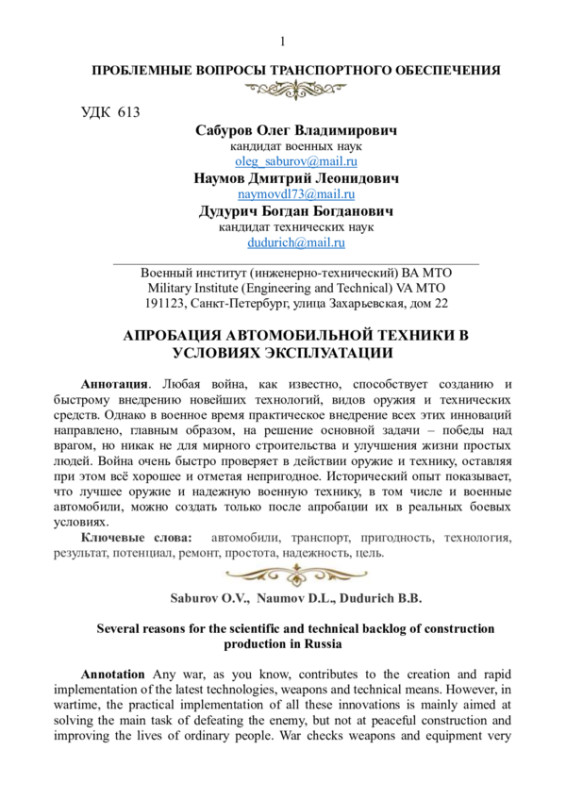 4. Легкая, мобильная, беспилотная транспортная платформа - технические особенности и возможность применения для нужд Вооруженных сил Российской Федерации / О. В. Сабуров, В. А. Мялькин, Б. Б. Дудурич, А. Н. Бирюков // Современные направления развития технологии, организации и экономики строительства: Сборник статей межвузовской научно - практической конференции, Санкт-Петербург, 19 апреля 2024 года - С. 264-269.