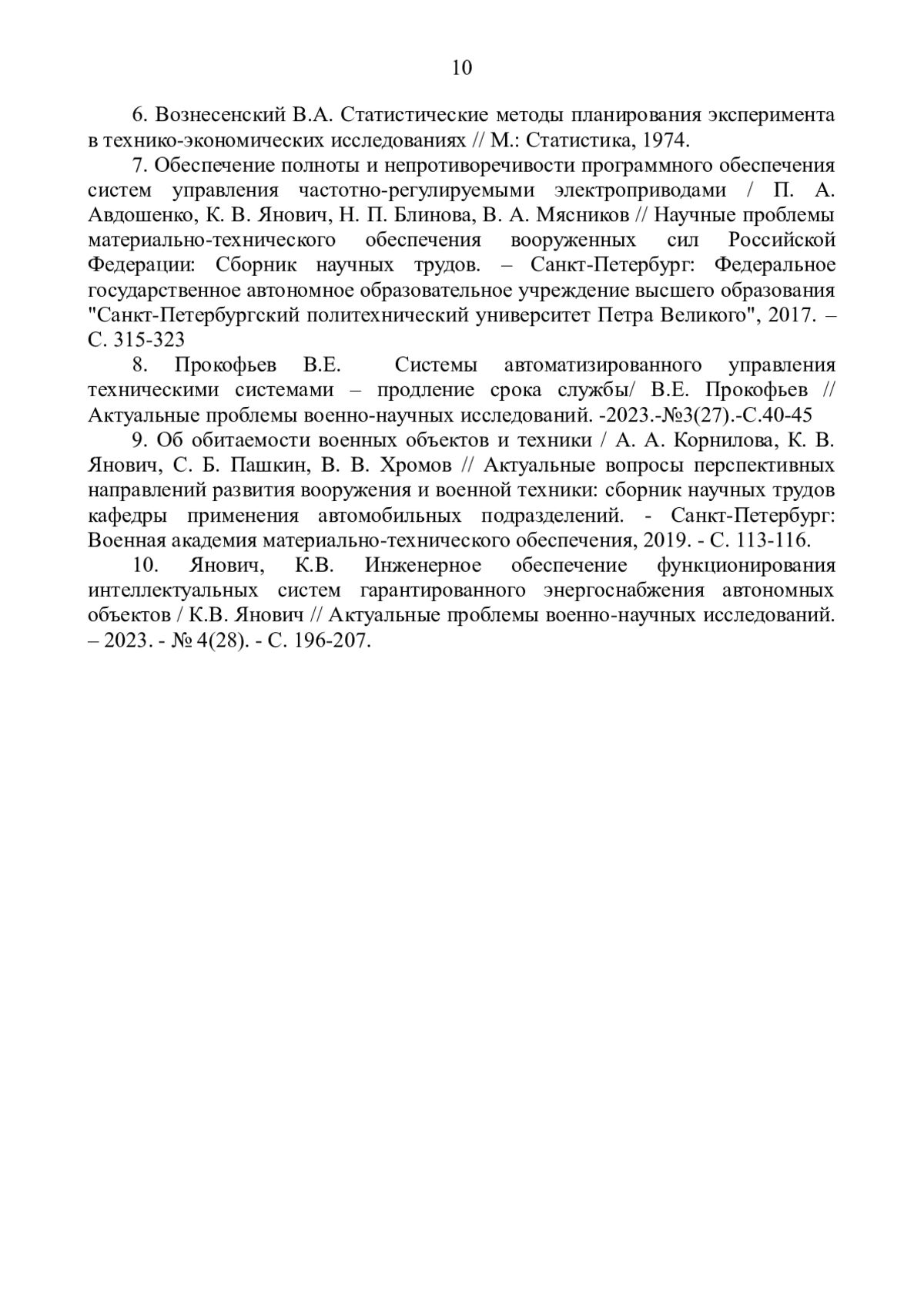 10. Янович, К.В. Инженерное обеспечение функционирования интеллектуальных систем гарантированного энергоснабжения автономных объектов / К.В. Янович // Актуальные проблемы военно - научных исследований. - 2023. - № 4(28). - С. 196-207. EDN: DOEBGP