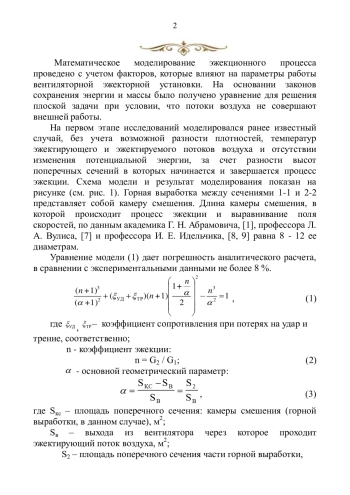 Математическое моделирование эжекционного процесса проведено с учетом факторов, которые влияют на параметры работы вентиляторной эжекторной установки. На основании законов сохранения энергии и массы было получено уравнение для решения плоской задачи при условии, что потоки воздуха не совершают внешней работы.
