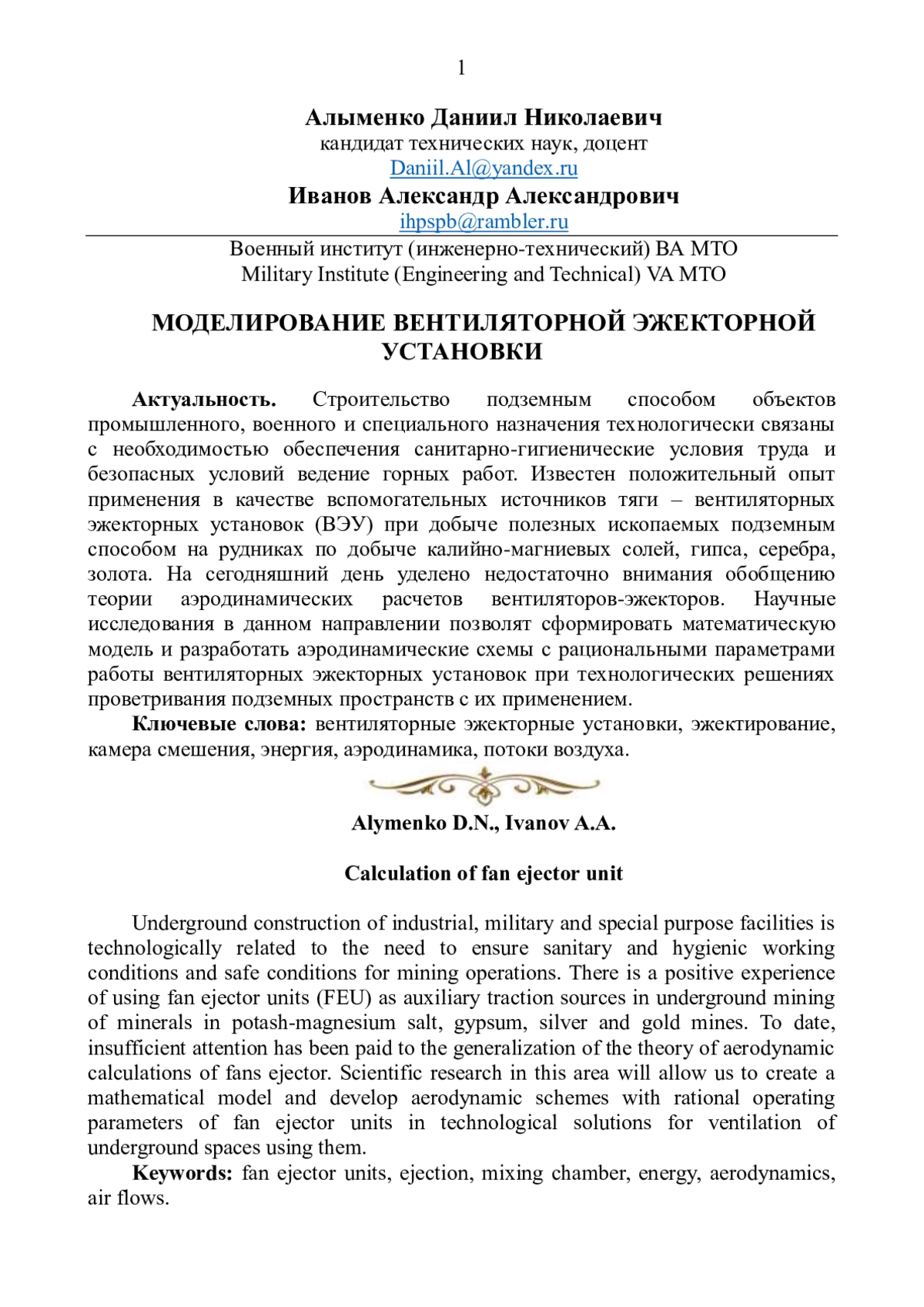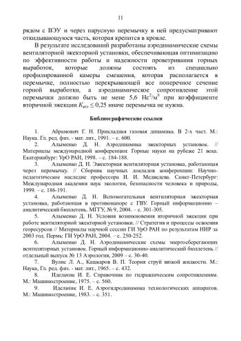 4. Алыменко Д. Н. Вспомогательная вентиляторная эжекторная установка, работающая в противонапоре с “ГВУ”. Горный информационно - аналитический бюллетень. “МГГУ”, № 9, 2004. - с. 301-305.