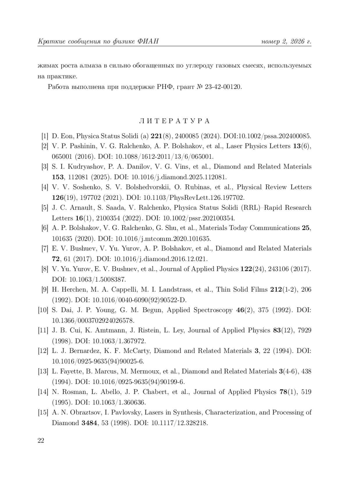 3. S. I. Kudryashov, P. A. Danilov, V. G. Vins, et al., Diamond and Related Materials 153, 112081 (2025). DOI: 10.1016/j.diamond.2025.112081