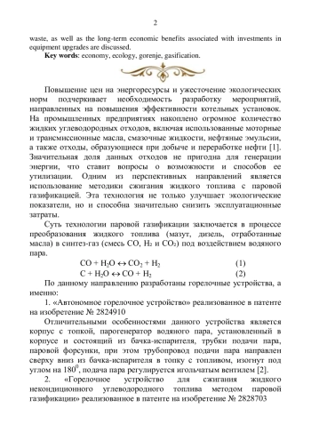 Повышение цен на энергоресурсы и ужесточение экологических норм подчеркивает необходимость разработку мероприятий, направленных на повышения эффективности котельных установок. На промышленных предприятиях накоплено огромное количество жидких углеводородных отходов, включая использованные моторные и трансмиссионные масла, смазочные жидкости, нефтяные эмульсии, а также отходы, образующиеся при добыче и переработке нефти [1]. Значительная доля данных отходов не пригодна для генерации энергии, что ставит вопросы о возможности и способов ее утилизации. Одним из перспективных направлений является использование методики сжигания жидкого топлива с паровой газификацией. Эта технология не только улучшает экологические показатели, но и способна значительно снизить эксплуатационные затраты.