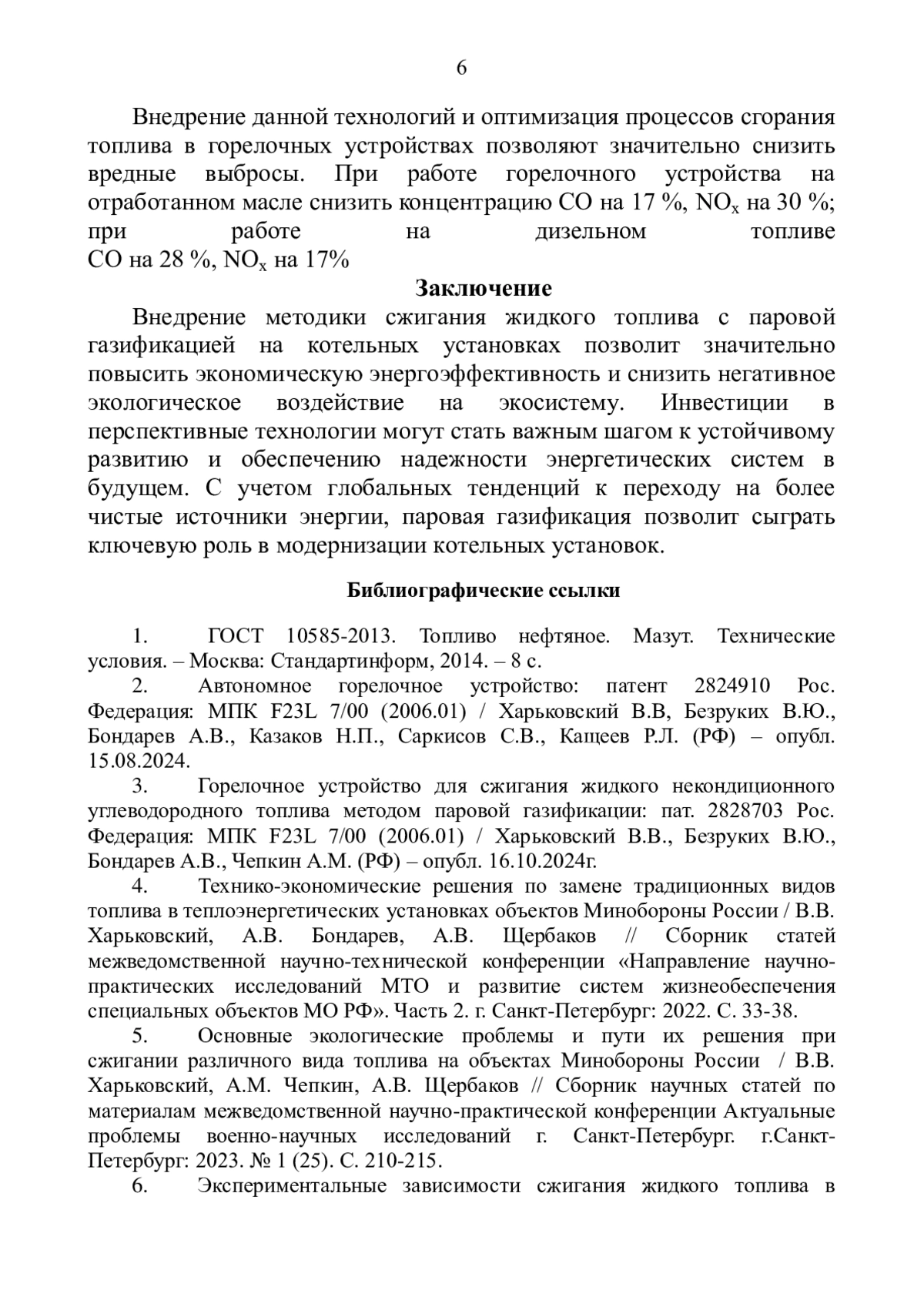 6. Экспериментальные зависимости сжигания жидкого топлива в горелочных устройствах с паровой газификацией/ В.В. Харьковский, А.В. Бондарев, В.Ю. Безруких, М.В. Русяйкин // Сборник научных трудов “Актуальные проблемы военно - научных исследований” - г.Санкт-Петербург: 2024г. - С. 292-300.