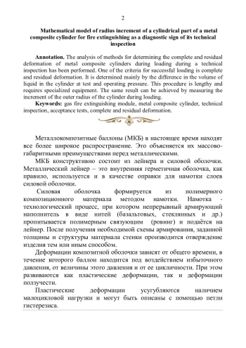 Выполнен анализ способов определения полной и остаточной деформации металлокомпозитных баллонов при проведении нагружения в ходе технического освидетельствования. Одним из критериев успешности нагружения является полная и остаточная деформация. Определяется она в основном по разнице объемов жидкости в баллоне при испытательном и рабочем давлении. Эта процедура продолжительна и требует специализированного оборудования. Такого же результата можно добиться проводя вовремя нагружения замеры приращения наружного радиуса баллона.