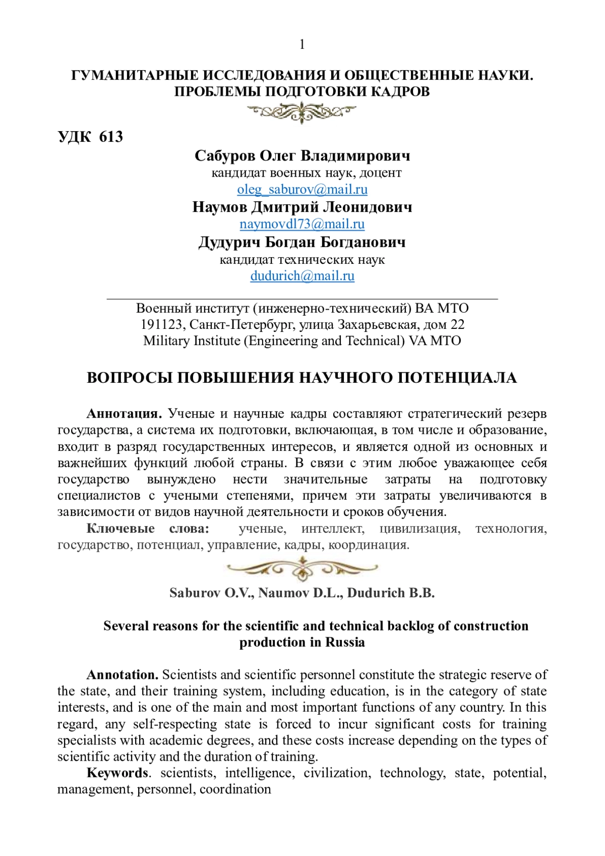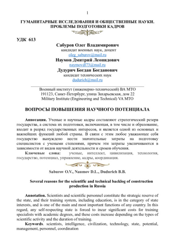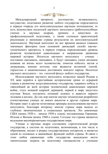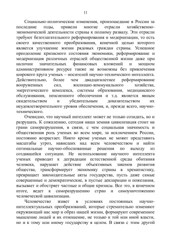 Международный авторитет, достоинство, независимость, могущество, позитивное развитие любого государства определяются в первую очередь его интеллектуальным научным потенциалом, то есть количеством носителей научного интеллекта (работоспособных ученых и научных кадров), уровнем и качеством их профессиональной подготовки, а также степенью практической реализации в экономике страны результатов их интеллектуальной деятельности. Научный интеллект во все времена являлся главным значимым фактором (или основной движущей силой) научнотехнического прогресса, в первую очередь определяющим уровень развития человеческой цивилизации и направления движения мировой истории. Носители научного интеллекта - ученые - постоянно оказывали, оказывают, и будут оказывать самое активное влияние на жизнь всего человечества, помогая избегать застоя и деградации, именно поэтому они являются истинной элитой, гордостью и национальным достоянием каждого народа. Носители научного интеллекта – это «золотой фонд» любого государства.