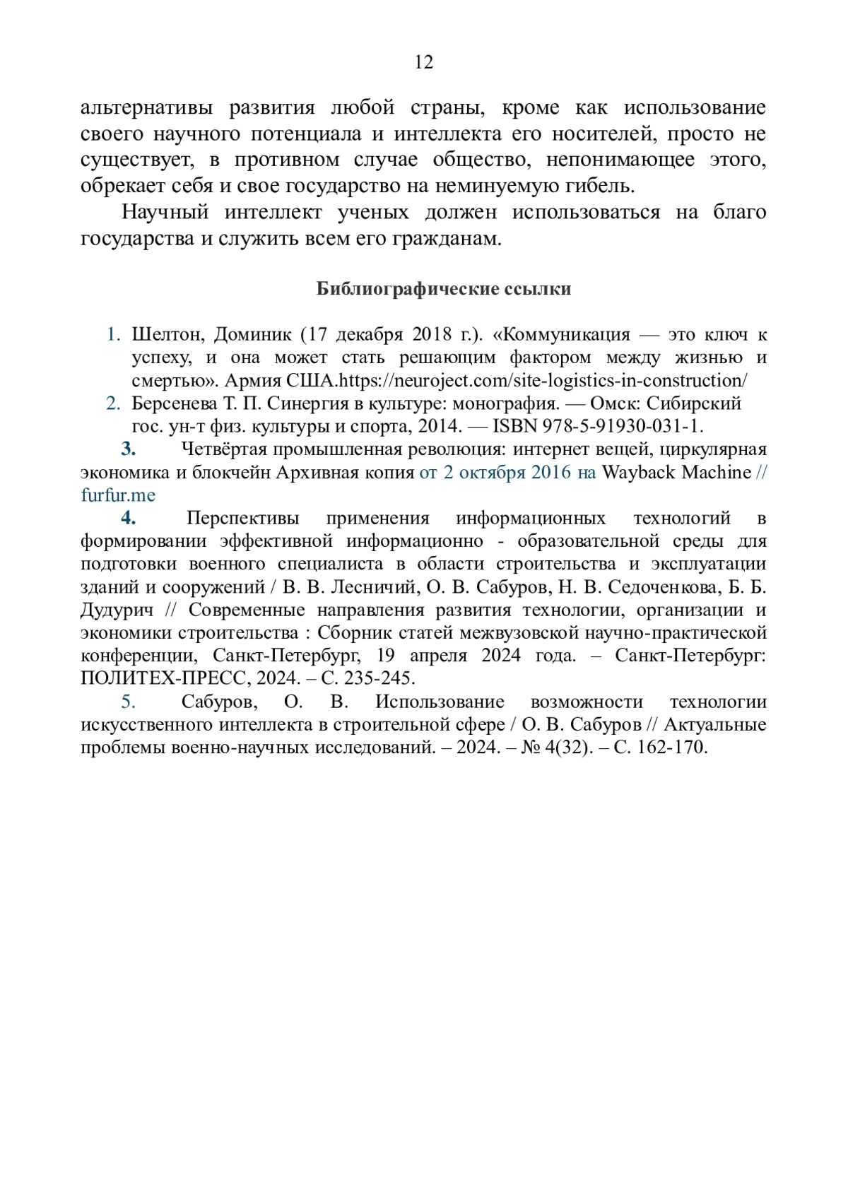 5. Сабуров, О. В. Использование возможности технологии искусственного интеллекта в строительной сфере / О. В. Сабуров // Актуальные проблемы военно - научных исследований. - 2024. - № 4(32)- С. 162-170. EDN: LLOCDL