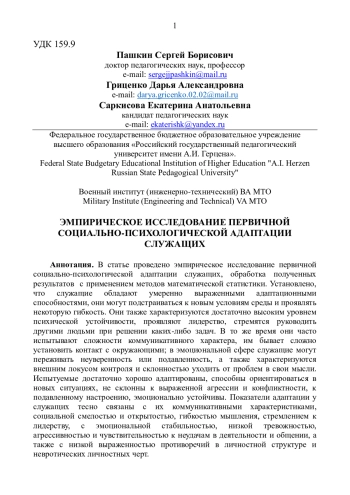 5. Пашкин С.Б., Мозеров С.А., Мозерова Е.С. Психолого - педагогические аспекты изучения индивидуальных особенностей военнослужащих // Военный инженер. 2018. №3(9). С. 48-59.