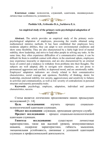Статья является логическим продолжением наших предыдущих исследований [1- 14]. Цель исследования: изучить психологической адаптации служащих.