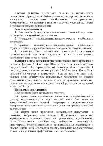 Объект исследования: служащие, проходящие срочную службу. Предмет исследования – процесс социально-психологической адаптации служащих. Гипотеза исследования: существуют личностные характеристики, такие как высокий уровень коммуникативных навыков, лидерские характеристики, гибкость мышления, эмоциональная устойчивость, связанные с успешной адаптацией служащих к профессиональной деятельности.