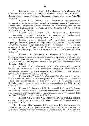 3. Корнилова А.А., Будко Д.Ю., Пашкин С.Б., Лобачев А.В. Современные представления о профессиональном психологическом отборе в Вооруженных Силах Российской Федерации. Ростов н/Д: 2016. 42 с. EDN: WQSACL