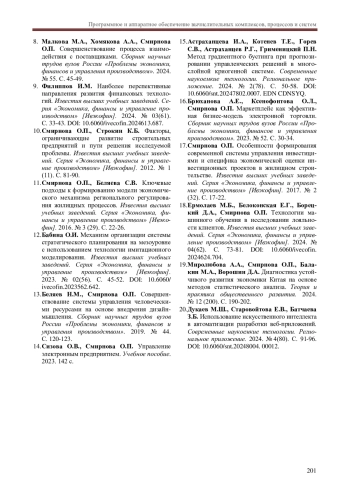 8. Малкова М.А., Хомякова А.А., Смирнова О.П. Совершенствование процесса взаимодействия с поставщиками. Сборник научных трудов вузов России “Проблемы экономики, финансов и управления производством”. 2024. № 55. С. 45-49. EDN: FLVSIL