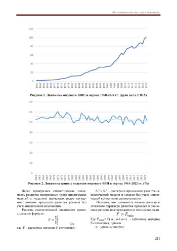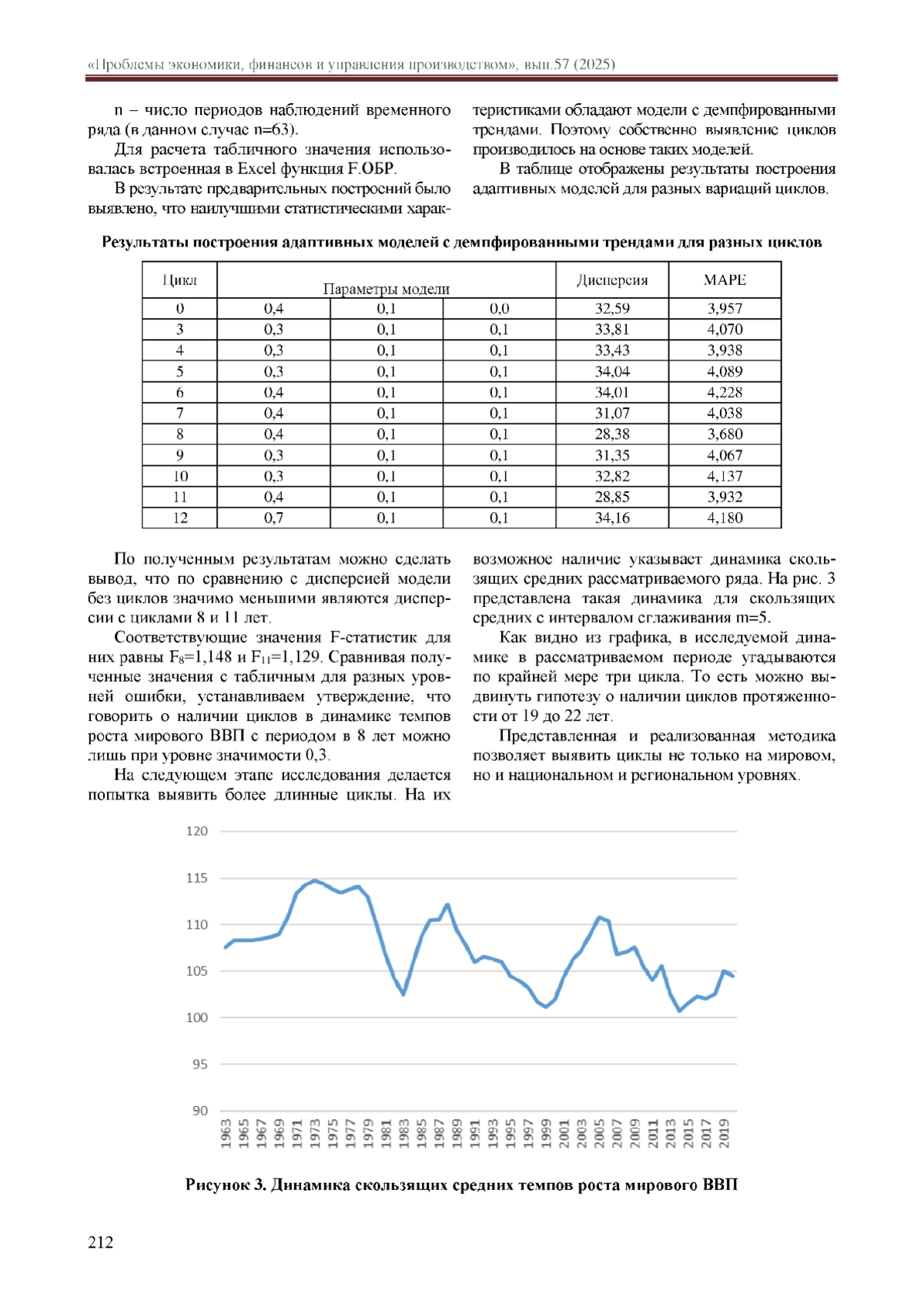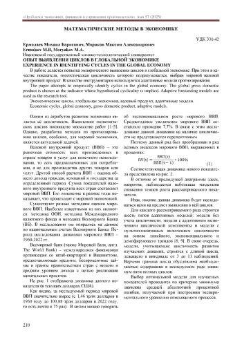 В работе делается попытка эмпирического выявления циклов в глобальной экономике. При этом в качестве показателя, гипотетическая цикличность которого подразумевается, выбран мировой валовой внутренний продукт. В качестве инструментария используются адаптивные модели прогнозирования.