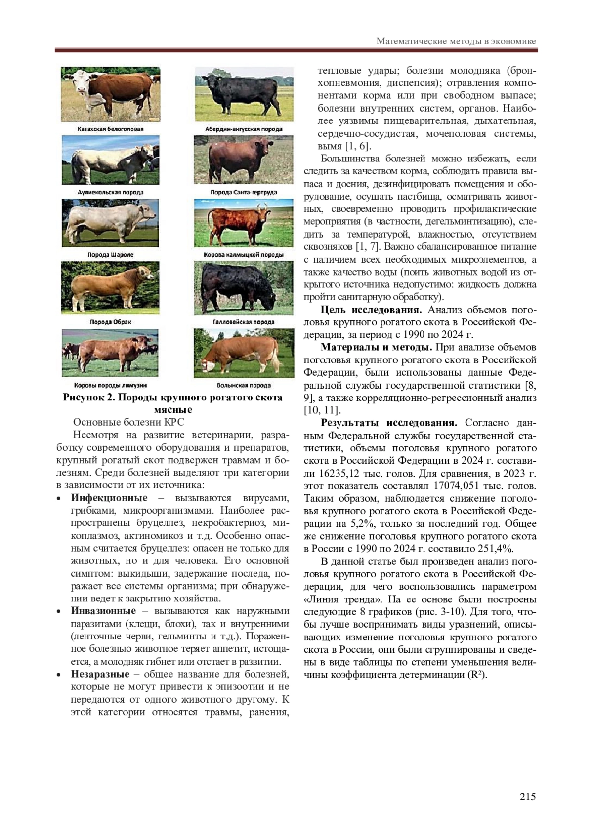 В данной статье проведен анализ объемов поголовья крупного рогатого скота в Российской Федерации, за период с 1990 по 2024 г. Подобраны математические модели, которые наиболее эффективно бы описывали объемы поголовья крупного рогатого скота в России. Показано, что наблюдается снижение поголовья крупного рогатого скота в Российской Федерации на 5,2%, только за последний год. Общее же снижение поголовья крупного рогатого скота в России с 1990 по 2024 г. составило 251,4%.