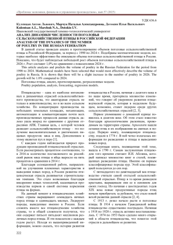 В данной статье проведен анализ и прогнозирование объемов поголовья сельскохозяйственной птицы в Российской Федерации, за период с 1990 по 2024 г. Подобраны математические модели, которые наиболее эффективно бы описывали объемы поголовья сельскохозяйственной птицы в России. Показано, что будет наблюдаться небольшой рост объемов поголовья сельскохозяйственной птицы в 2026 г. Рост составит 1,0% по сравнению с показателями 2024 г.