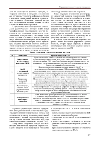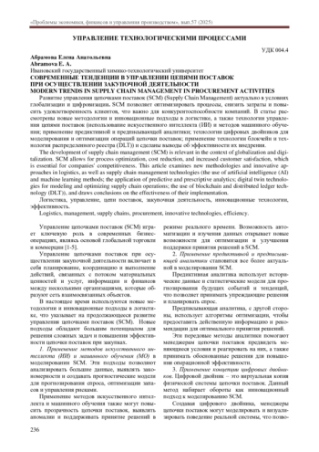 Развитие управления цепочками поставок (SCM) (Supply Chain Management) актуально в условиях глобализации и цифровизации. SCM позволяет оптимизировать процессы, снизить затраты и повысить удовлетворенность клиентов, что важно для конкурентоспособности компаний. В статье рассмотрены новые методологии и инновационные подходы в логистике, а также технологии управления цепями поставок (использование искусственного интеллекта (ИИ) и методов машинного обучения; применение предиктивной и предписывающей аналитики; технологии цифровых двойников для моделирования и оптимизации операций цепочки поставок; применение технологии блокчейн и технология распределенного реестра (DLT)) и сделаны выводы об эффективности их внедрения.