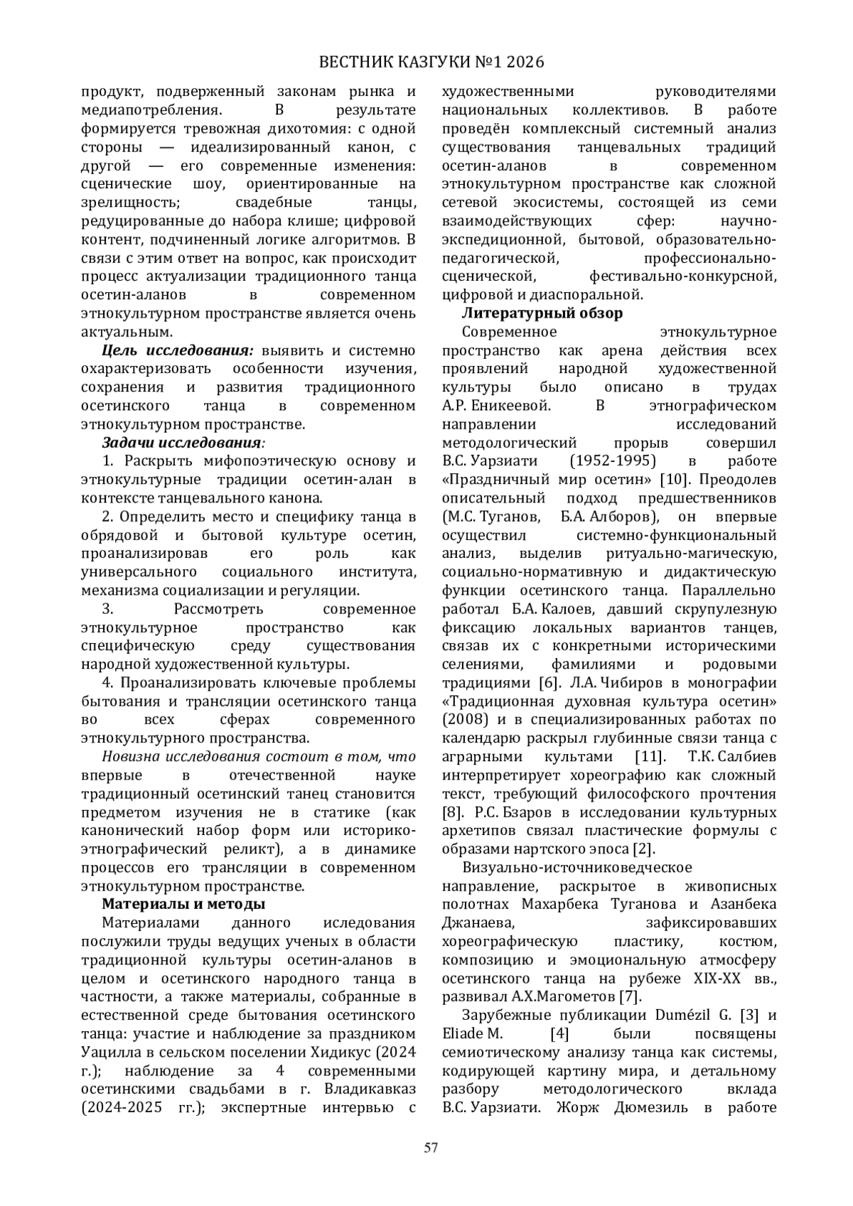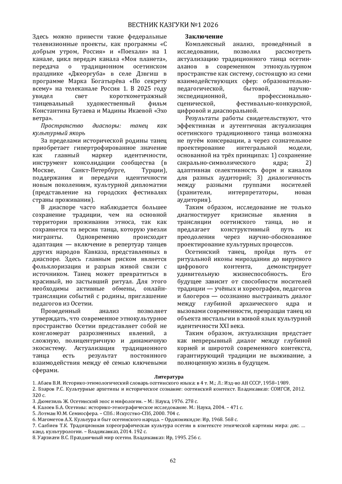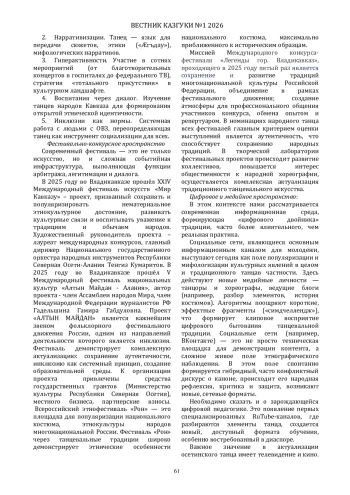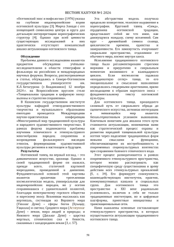 В статье рассматривается современное этнокультурное пространство как полицентричная экосистема сохранения и развития традиционного осетинского танца. Проведён комплексный анализ существования танцевальных традиций осетин-аланов в современном этнокультурном пространстве как сложной сетевой экосистемы, состоящей из семи взаимодействующих сфер: научно-экспедиционной, бытовой, образовательно-педагогической, профессионально-сценической, фестивально-конкурсной, цифровой и диаспоральной.