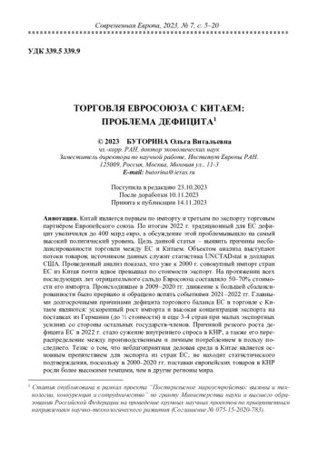 Китай является первым по импорту и третьим по экспорту торговым партнёром Европейского союза. По итогам 2022 г. традиционный для ЕС дефицит увеличился до 400 млрд евро, а обсуждение этой проблемывышло на самый высокий политический уровень. Цель данной статьи – выявить причины несбалансированности торговли между ЕС и Китаем. Объектом анализа выступают потоки товаров; источником данных служит статистика UNCTADstat в долларах США. Проведенный анализ показал, что уже к 2000 г. совокупный импорт стран ЕС из Китая почти вдвое превышал по стоимости экспорт. На протяжении всех последующих лет отрицательного сальдо Евросоюза составляло 50–70% стоимости его импорта. Происходившее в 2009–2020 гг. движение к большей сбалансированности было прервано и обращено вспять событиями 2021–2022 гг. Главными долгосрочными причинами дефицита торгового баланса ЕС в торговле с Китаем являются: ускоренный рост импорта и высокая концентрация экспорта на поставках из Германии (до ½ стоимости) и еще 3-4 стран при малых экспортных усилиях со стороны остальных государств-членов. Причиной резкого роста дефицита ЕС в 2022 г. стало сужение внутреннего спроса в КНР, а также его перераспределение между производственным и личным потреблением в пользу последнего. Тезис о том, что неблагоприятная деловая среда в Китае является основным препятствием для экспорта из стран ЕС, не находит статистического подтверждения, поскольку в 2000–2020 гг. поставки европейских товаров в КНР росли более высокими темпами, чем в другие регионы мира.