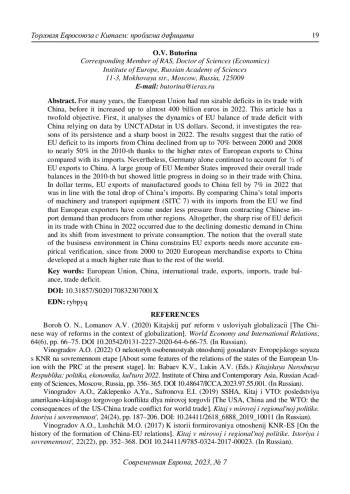 1. Борох О.Н., Ломанов А.В. (2020) Китайский путь реформ в условиях глобализации Мировая экономика и международные отношения. Т. 64. № 6. С. 66-75. DOI: 10.20542/0131-2227-2020-64-6-66-75 EDN: MNZPJU