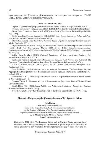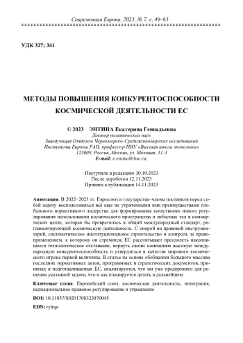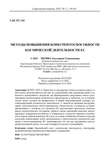 В 2022−2023 гг. Евросоюз и государства‒члены поставили перед собой задачу воспользоваться всё еще не утраченными ими преимуществами глобального нормативного лидерства для формирования качественно нового регулирования использования космического пространства и небесных тел в коммерческих целях, которая бы превратилась в общий международный стандарт, регламентирующий космическую деятельность. С опорой на правовой инструментарий, систематическое институциональное строительство и контроль за правоприменением, к которому он стремится, ЕС рассчитывает преодолеть накопившееся технологическое отставание, вернуть своим компаниям высокую международную конкурентоспособность и утвердиться в качестве мирового космического игрока первой величины. В статье на основе обобщения большого массива последних нормативных актов, программных и стратегических документов, принятых и подготавливаемых ЕС, анализируется, что им уже предпринято для решения указанной задачи, что и как планируется делать в дальнейшем