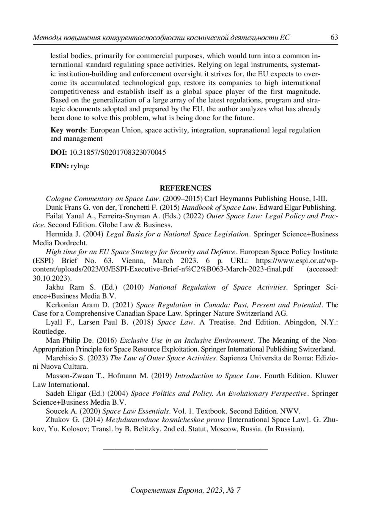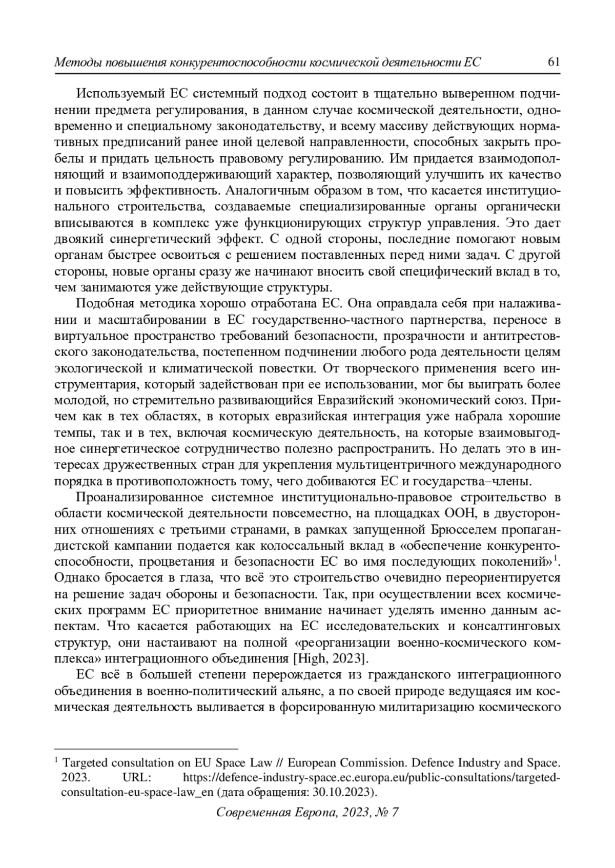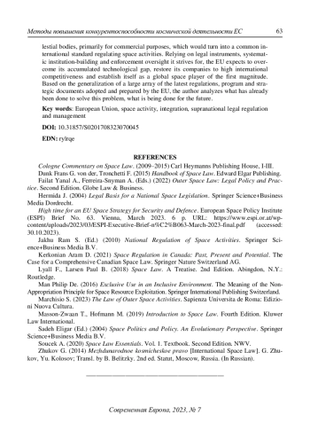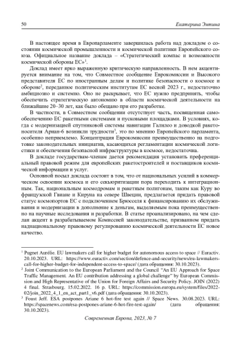 6. High time for an EU Space Strategy for Security and Defence. European Space Policy Institute (ESPI) Brief No. 63. Vienna, March 2023. 6 p. URL: https://www.espi.or.at/wp-content/uploads/2023/03/ESPI-Executive-Brief-n%C2%B063-March-2023-final.pdf (accessed: 30.10.2023).