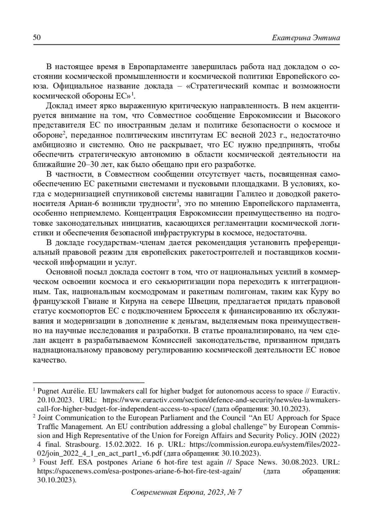 В настоящее время в Европарламенте завершилась работа над докладом о состоянии космической промышленности и космической политики Европейского союза. Официальное название доклада ‒ «Стратегический компас и возможности космической обороны ЕС»1. Доклад имеет ярко выраженную критическую направленность. В нем акцентируется внимание на том, что Совместное сообщение Еврокомиссии и Высокого представителя ЕС по иностранным делам и политике безопасности о космосе и обороне2, переданное политическим институтам ЕС весной 2023 г., недостаточно амбициозно и системно. Оно не раскрывает, что ЕС нужно предпринять, чтобы обеспечить стратегическую автономию в области космической деятельности на ближайшие 20‒30 лет, как было обещано при его разработке