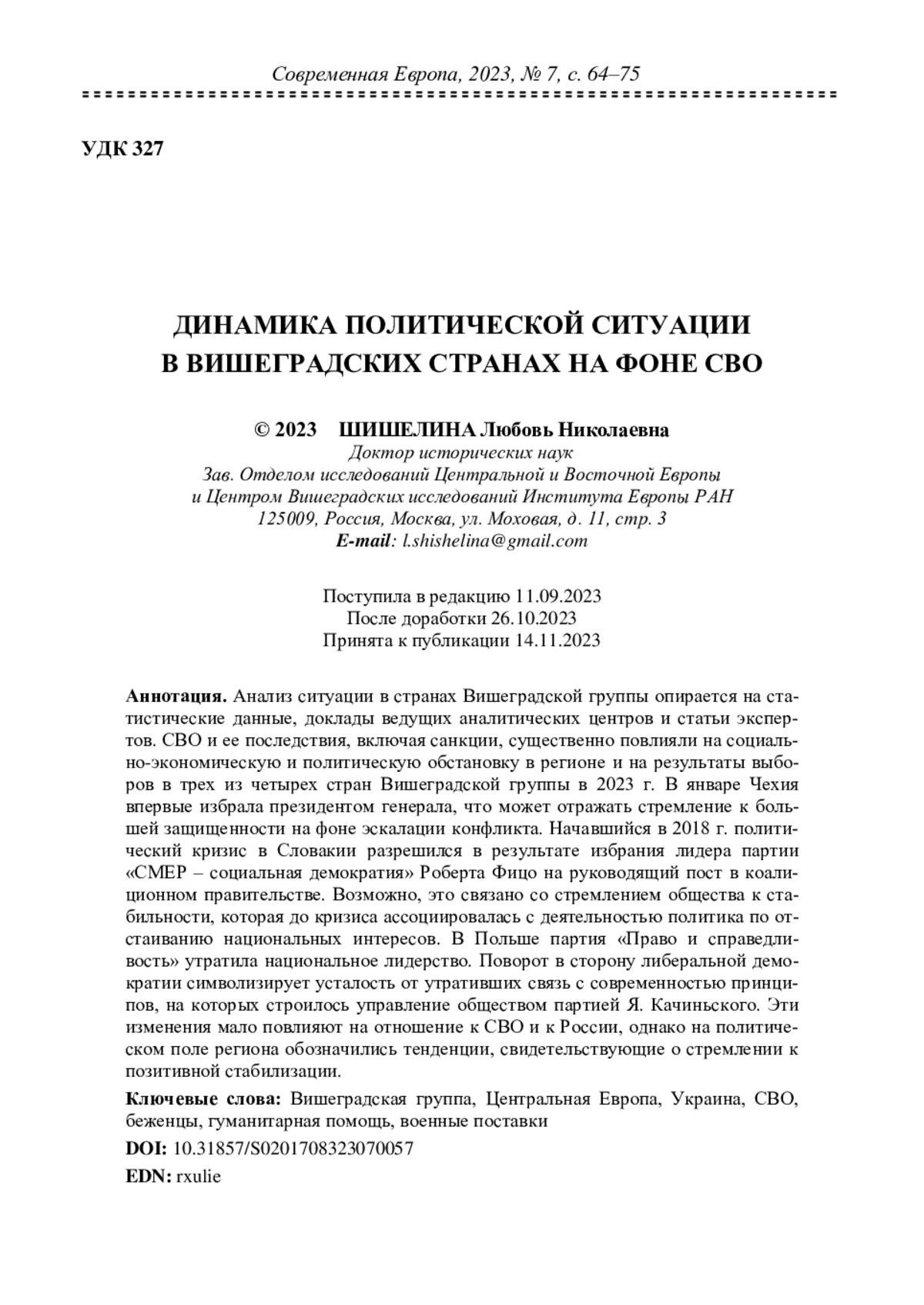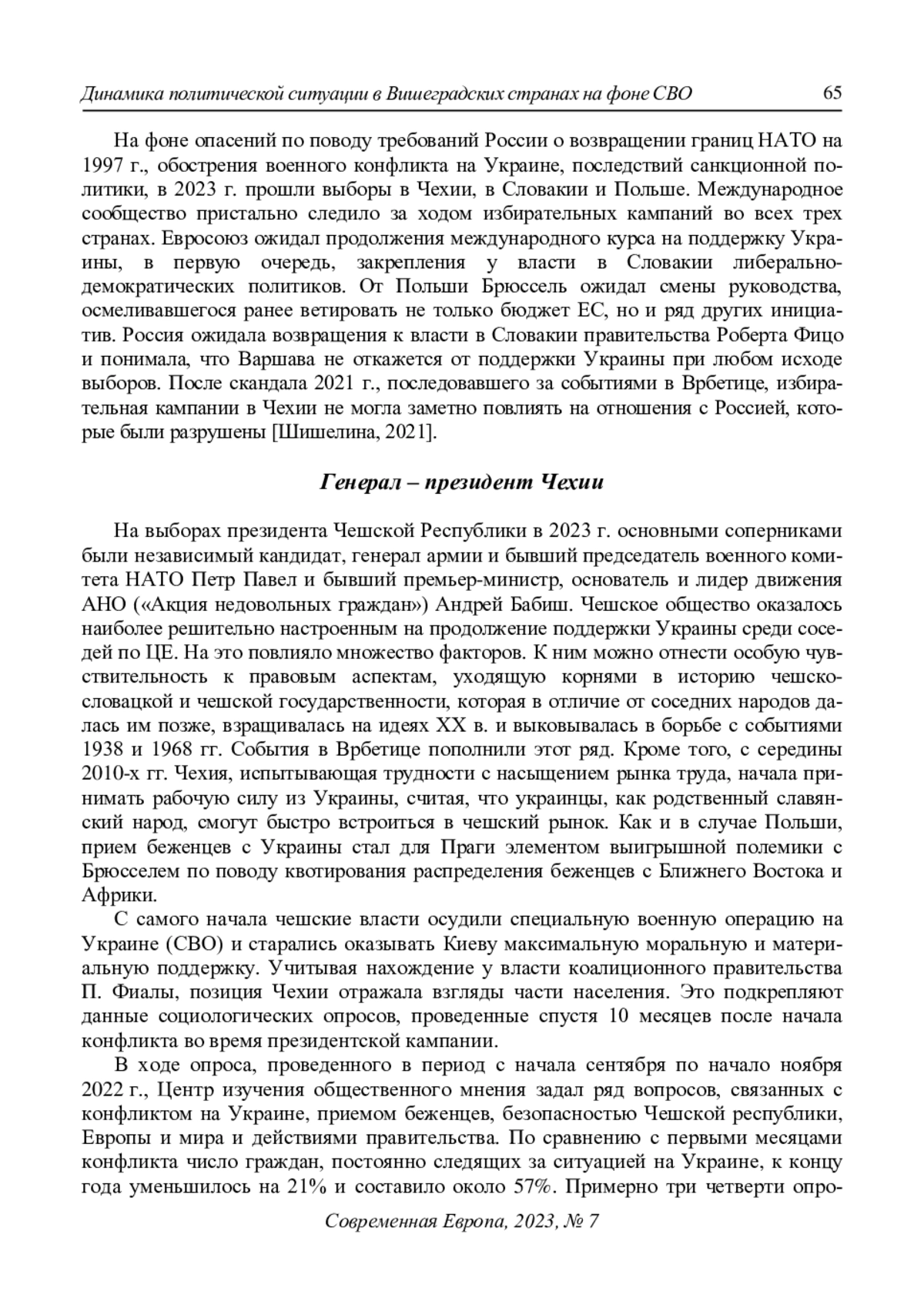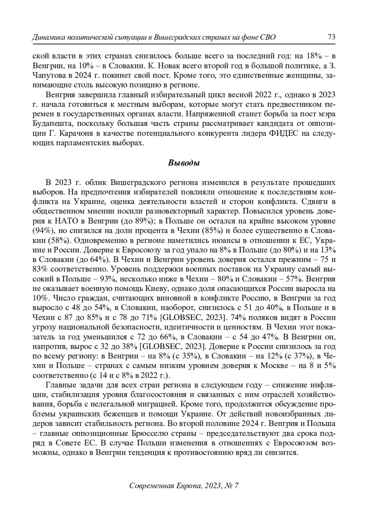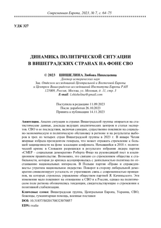 Анализ ситуации в странах Вишеградской группы опирается на статистические данные, доклады ведущих аналитических центров и статьи экспертов. СВО и ее последствия, включая санкции, существенно повлияли на социально-экономическую и политическую обстановку в регионе и на результаты выборов в трех из четырех стран Вишеградской группы в 2023 г. В январе Чехия впервые избрала президентом генерала, что может отражать стремление к большей защищенности на фоне эскалации конфликта. Начавшийся в 2018 г. политический кризис в Словакии разрешился в результате избрания лидера партии «СМЕР – социальная демократия» Роберта Фицо на руководящий пост в коалиционном правительстве. Возможно, это связано со стремлением общества к стабильности, которая до кризиса ассоциировалась с деятельностью политика по отстаиванию национальных интересов. В Польше партия «Право и справедливость» утратила национальное лидерство. Поворот в сторону либеральной демократии символизирует усталость от утративших связь с современностью принципов, на которых строилось управление обществом партией Я. Качиньского. Эти изменения мало повлияют на отношение к СВО и к России, однако на политическом поле региона обозначились тенденции, свидетельствующие о стремлении к позитивной стабилизации