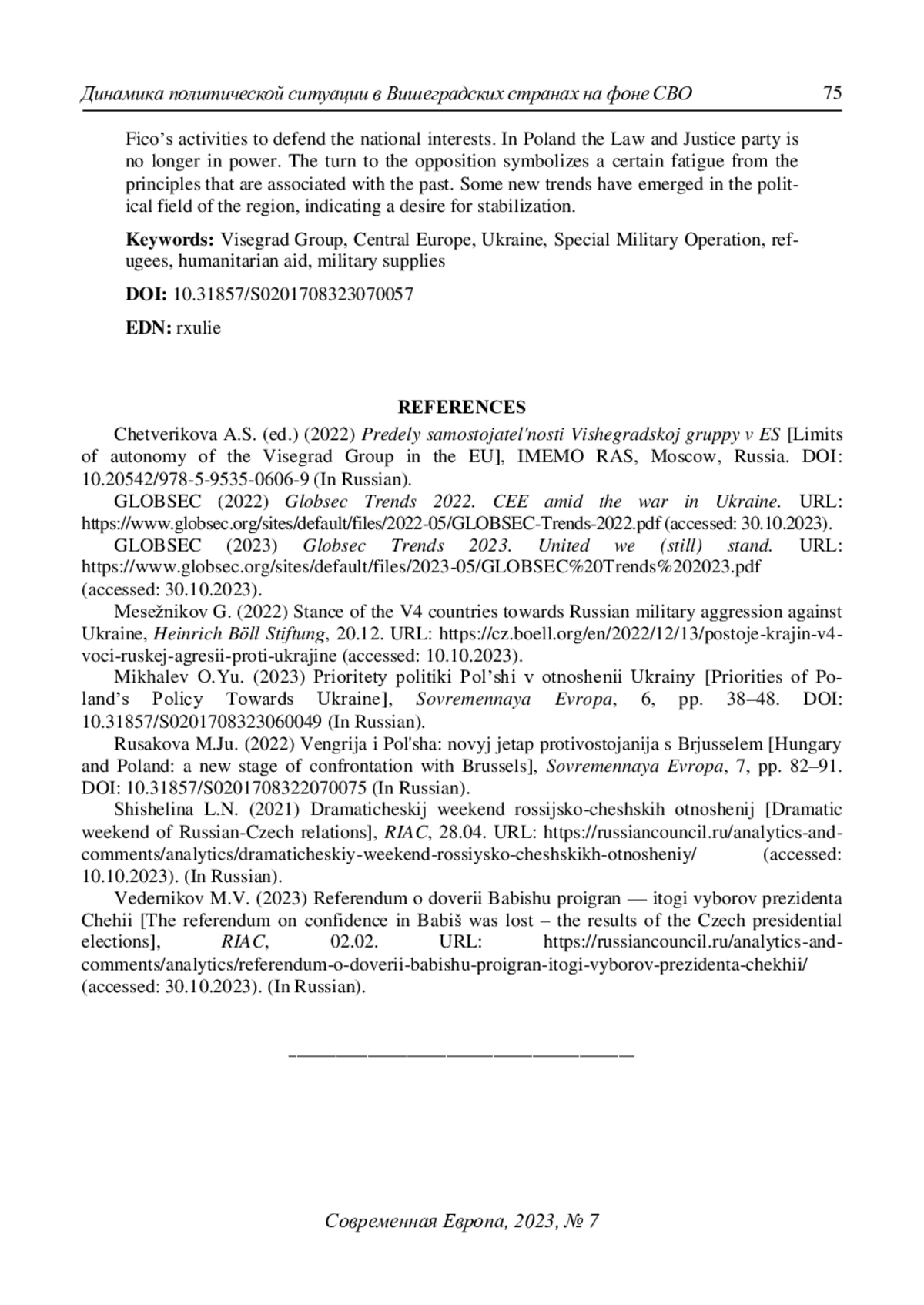 6. GLOBSEC (2022) Globsec Trends 2022. CEE amid the war in Ukraine. URL: https://www.globsec.org/sites/default/files/2022-05/GLOBSEC-Trends-2022.pdf.