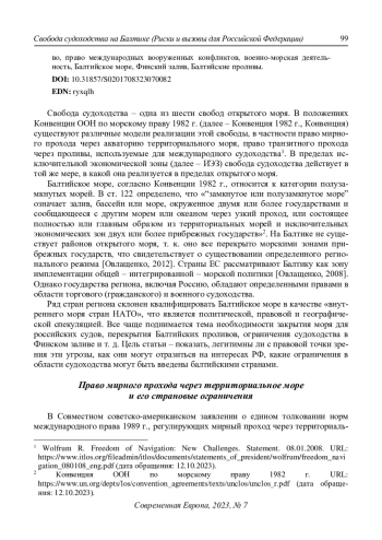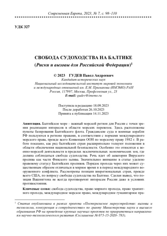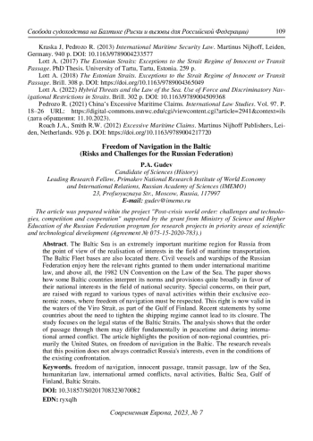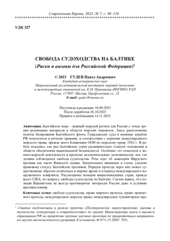 Балтийское море ‒ важный морской регион для России с точки зрения реализации интересов в области морских перевозок. Здесь расположены пункты базирования Балтийского флота. Гражданские суда и военные корабли РФ пользуются в регионе правами, в соответствии с нормами международного морского права, прежде всего Конвенции ООН по морскому праву 1982 г. В работе показано, как ряд балтийских стран расширительно толкуют положения в области обеспечения национальной безопасности. Особенно это относится к военно-морской деятельности в пределах исключительных экономических зон, где должна соблюдаться свобода судоходства. Речь идет об акватории Вируского пролива как части Финского залива. Значительнео внимание в статье уделено правовому статусу Балтийских проливов. Порядок прохода через них может существенным образом отличаться в мирное время и в период международного вооруженного конфликта. Рассмотрены позиции внерегиональных стран, прежде всего США, по вопросу свободы судоходства на Балтике. Сделан вывод, что позиция Вашингтона не всегда противоречит интересам России даже в условиях противостояния
