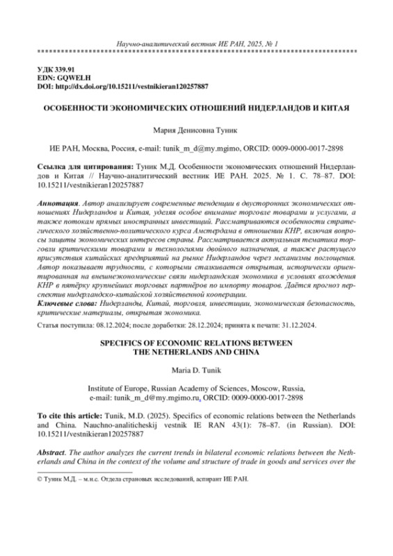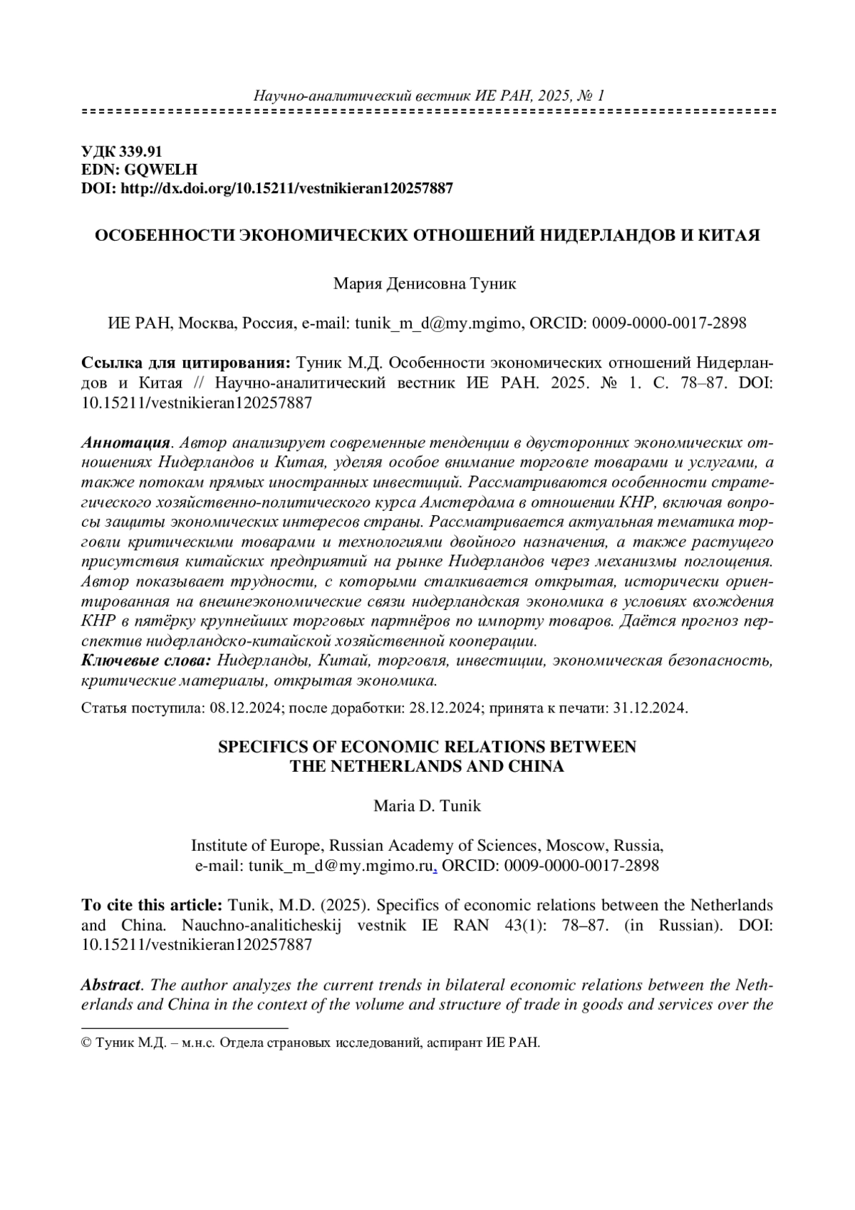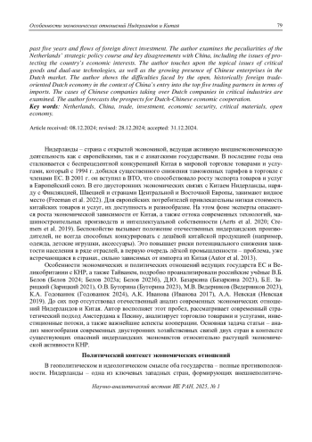 Автор анализирует современные тенденции в двусторонних экономических отношениях Нидерландов и Китая, уделяя особое внимание торговле товарами и услугами, а также потокам прямых иностранных инвестиций. Рассматриваются особенности стратегического хозяйственно-политического курса Амстердама в отношении КНР, включая вопросы защиты экономических интересов страны. Рассматривается актуальная тематика торговли критическими товарами и технологиями двойного назначения, а также растущего присутствия китайских предприятий на рынке Нидерландов через механизмы поглощения. Автор показывает трудности, с которыми сталкивается открытая, исторически ориентированная на внешнеэкономические связи нидерландская экономика в условиях вхождения КНР в пятёрку крупнейших торговых партнёров по импорту товаров. Даётся прогноз перспектив нидерландско-китайской хозяйственной кооперации