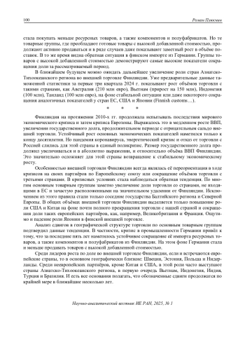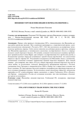 18. Плюснин, Р.М. (2024). Финляндия в мировой торговле. Факторы интеграции и глобализации. М.: ИЕ РАН, 2024. EDN: ARLLNJ