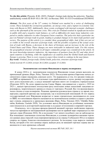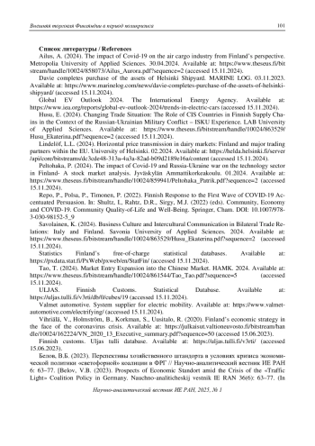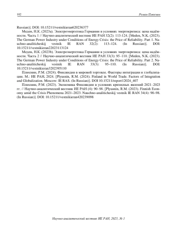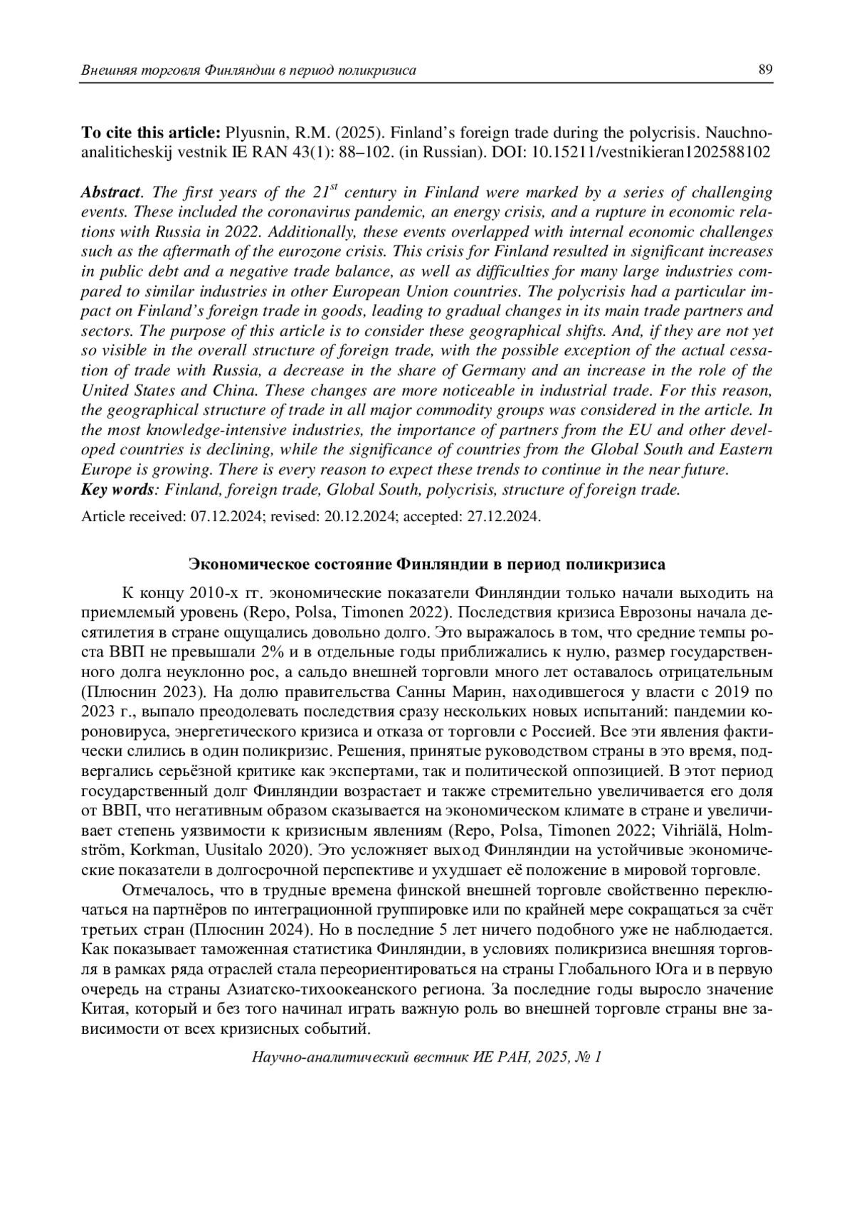 19. Плюснин, Р.М. (2023). Экономика Финляндии в условиях кризисных явлений 2021-2023 гг. // Научно-аналитический вестник ИЕ РАН (4): 90-98.