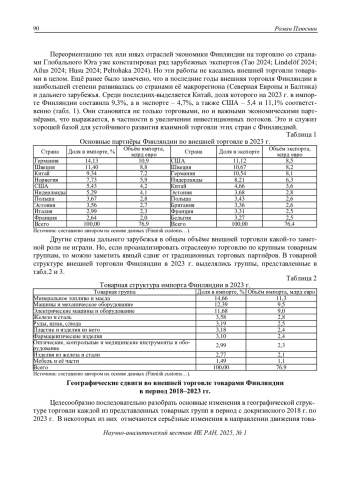 Первые годы третьего десятилетия XXI в. ознаменовались для Финляндии целым рядом кризисных явлений. Это и пандемия коронавируса, и энергетический кризис, и разрыв экономических отношений с Россией в 2022 г. Всё это наложилось на внутренние экономические проблемы страны. Сюда можно отнести последствия кризиса еврозоны, которые для Финляндии выразились в значительном увеличении государственного долга и в отрицательном сальдо торгового баланса. Не назвать успешной экономическую политику предыдущего правительства Санны Марин, при котором государственный долг продолжил расти, а большинство крупных отраслей испытывало гораздо больше трудностей, чем аналогичные отрасли в других странах ЕС. Результатом поликризиса для Финляндии стали, в частности, постепенные изменения основных направлений внешней торговли товарами. Цель данной статьи – рассмотреть эти сдвиги. И если в общей структуре внешней торговли они ещё не столь видны, за исключением, пожалуй, фактического прекращения торговли с Россией, уменьшения доли Германии и повышения роли США и Китая, то в отраслевом аспекте они более заметны. По этой причине была рассмотрена географическая структура торговли по всем основным товарным группам. За исключением самых наукоёмких отраслей, значимость партнёров по ЕС и ряда развитых стран снижается, а стран Глобального Юга и Восточной Европы – повышается. И есть все основания полагать, что эти тенденции в ближайшее время не изменятся