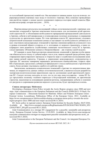 4. Joint Communication to the European Parliament and the Council. An integrated European Union policy for the Arctic. European External Action Service. 27.04.2016. Available at: https://www.europarl.europa.eu/meetdocs/2014_2019/plmrep/COMMITTEES/CJ26/JOIN/2016/11-07/COM_JOIN(2016)0021_EN.pdf (accessed 08.11.2024).