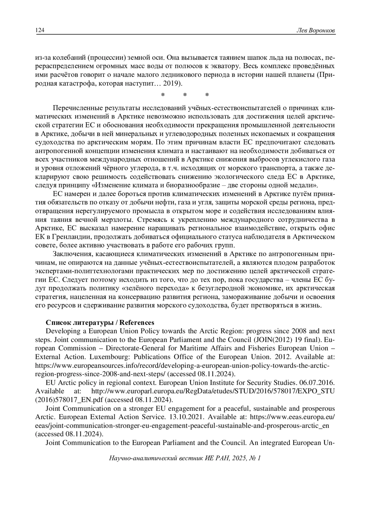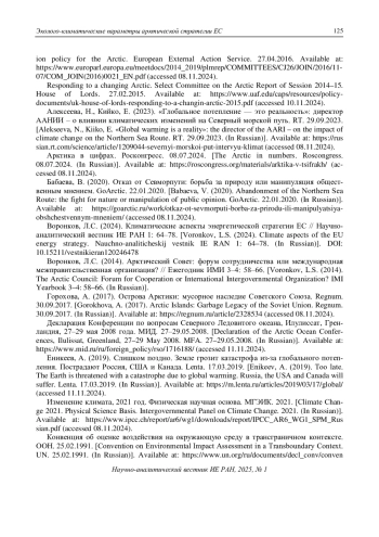 9. Воронков, Л.С. (2024). Климатические аспекты энергетической стратегии ЕС // Научно-аналитический вестник ИЕ РАН 1: 64-78.