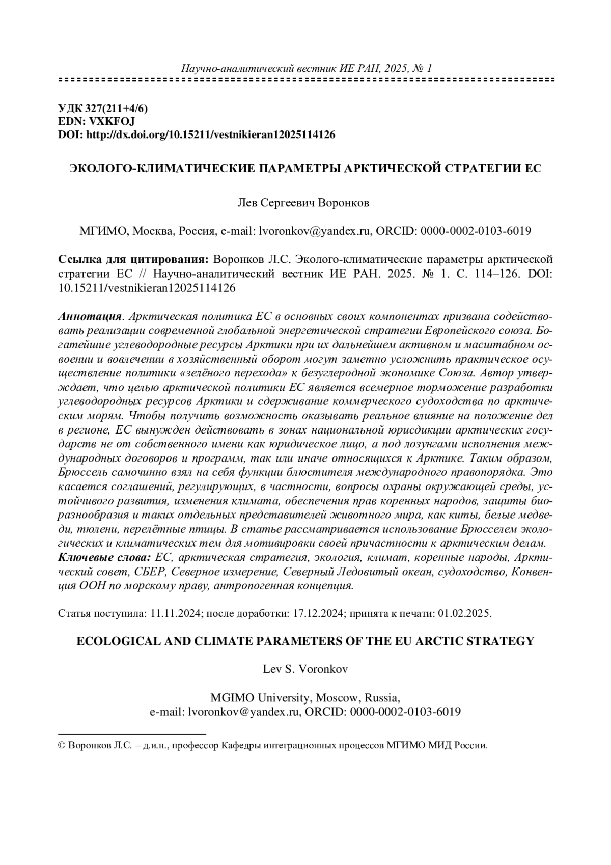 Voronkov, L.S. (2024). Climate aspects of the EU energy strategy. Nauchno-analiticheskij vestnik IE RAN 1: 64-78. (In Russian). DOI: 10.15211/vestnikieran120246478