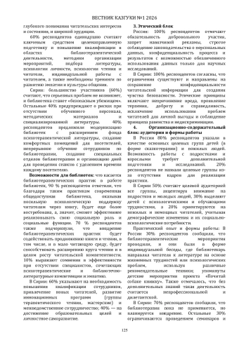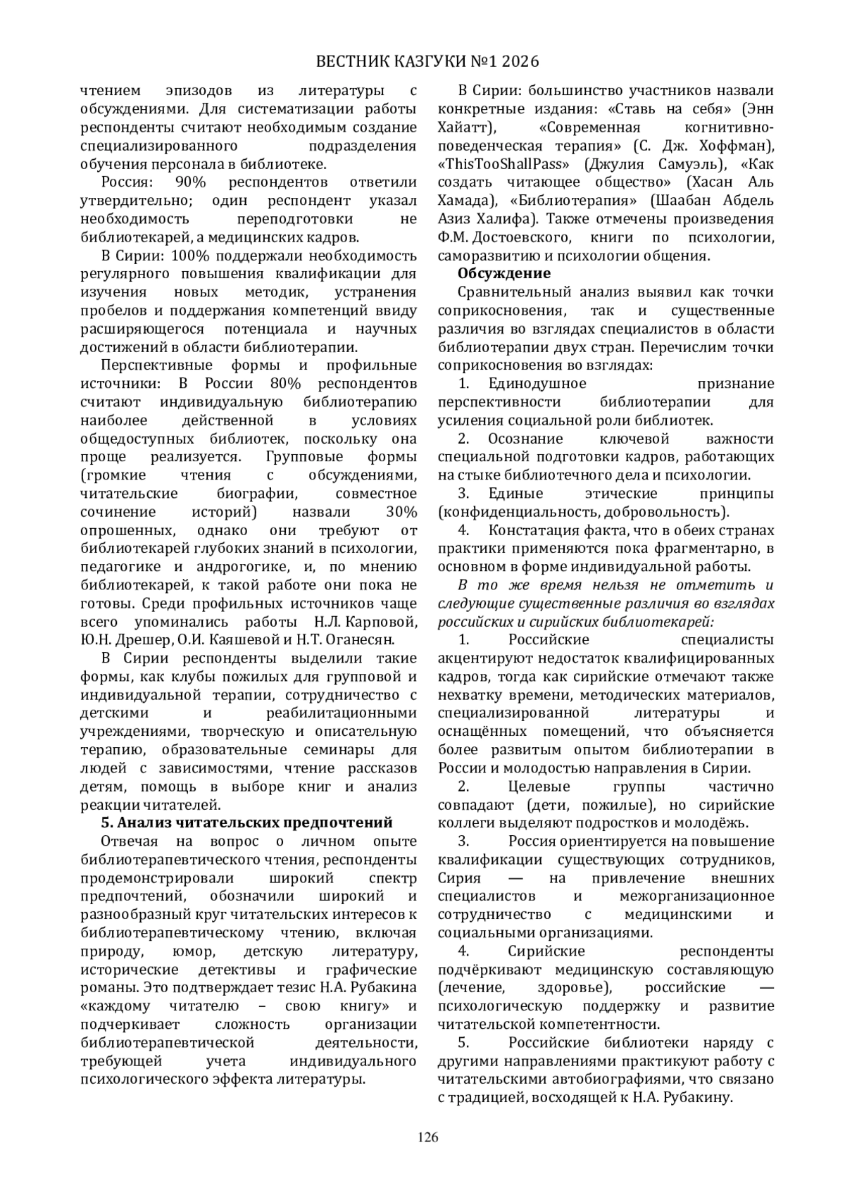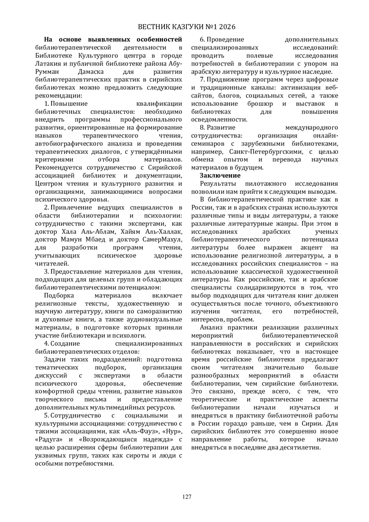 В статье приводятся результаты сравнительного анализа мнений сотрудников публичных библиотек России и Сирии о библиотерапевтической деятельности. Для исследования использованы полуструктурированные интервью с представителями трёх библиотек Санкт-Петербурга и двух сирийских библиотек (Латакия, Дамаск). Обнаружены общие взгляды на перспективность исследуемого направления деятельности публичных библиотек, важность кадровых и этических вопросов. Российские специалисты отмечают необходимость повышения квалификации и психологической поддержки персонала, тогда как сирийские приоритетно выделяют проблемы с инфраструктурой, ресурсами и медицинскими аспектами. На основе результатов даны рекомендации для сирийских библиотек: повышение квалификации работников, создание специализированных отделов и развитие межбиблиотечного сотрудничества.