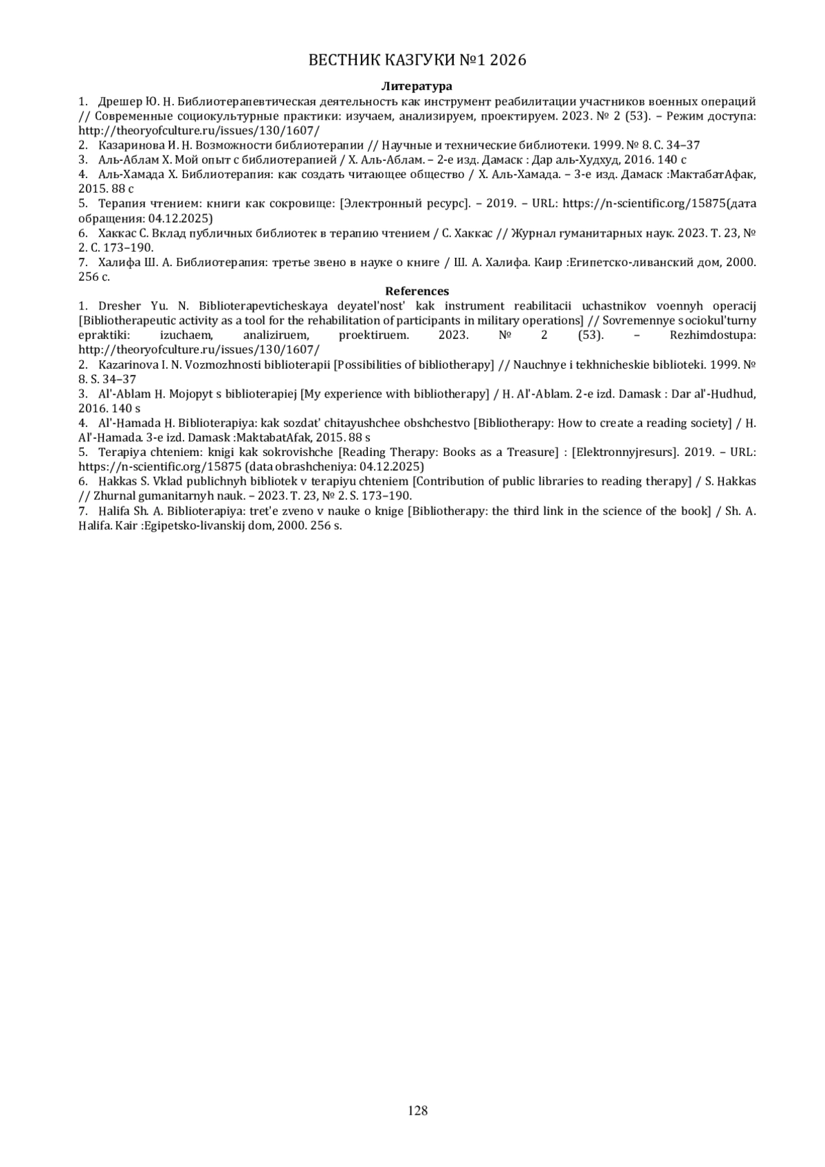 6. Хаккас С. Вклад публичных библиотек в терапию чтением / С. Хаккас // Журнал гуманитарных наук. 2023. Т. 23, № 2. С. 173-190.