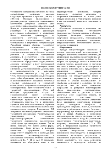 В статье предлагается обоснование понимания в качестве структуроопределяющего основания творческого саморазвития. Показывается, что понимание является основой конструкции системообразующих компонентов творческого саморазвития. Предлагается содержательный анализ феномена понимания. Определяется роль диалога в понимании и место понимания в самопознании. Раскрывается логика взаимодействия понимания с метафорой и интуицией.