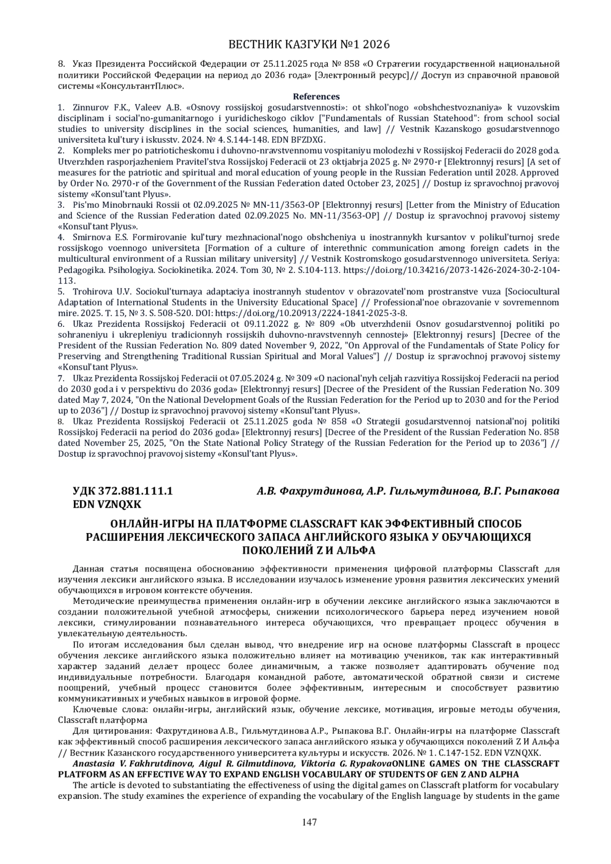8. Указ Президента Российской Федерации от 25.11.2025 года № 858 “О Стратегии государственной национальной политики Российской Федерации на период до 2036 года” [Электронный ресурс]// Доступ из справочной правовой системы “КонсультантПлюс”.