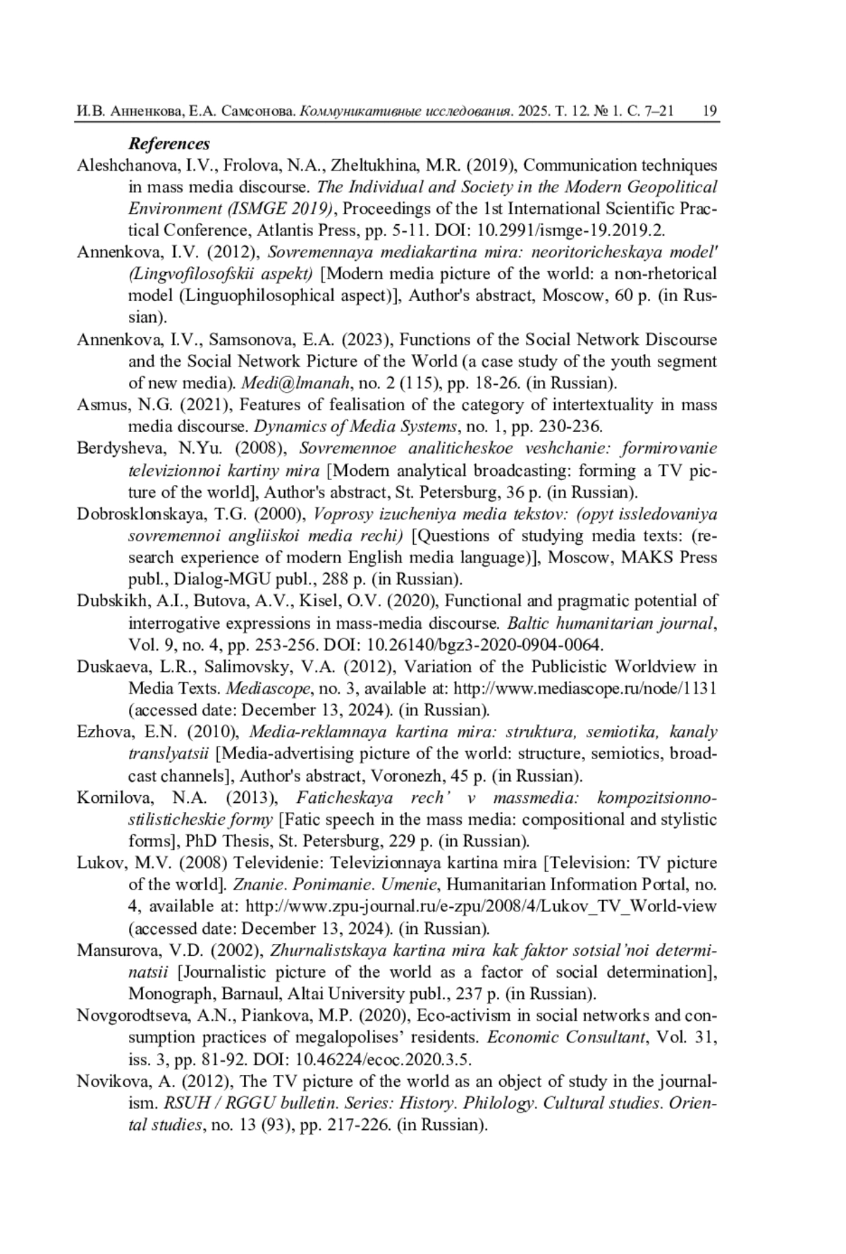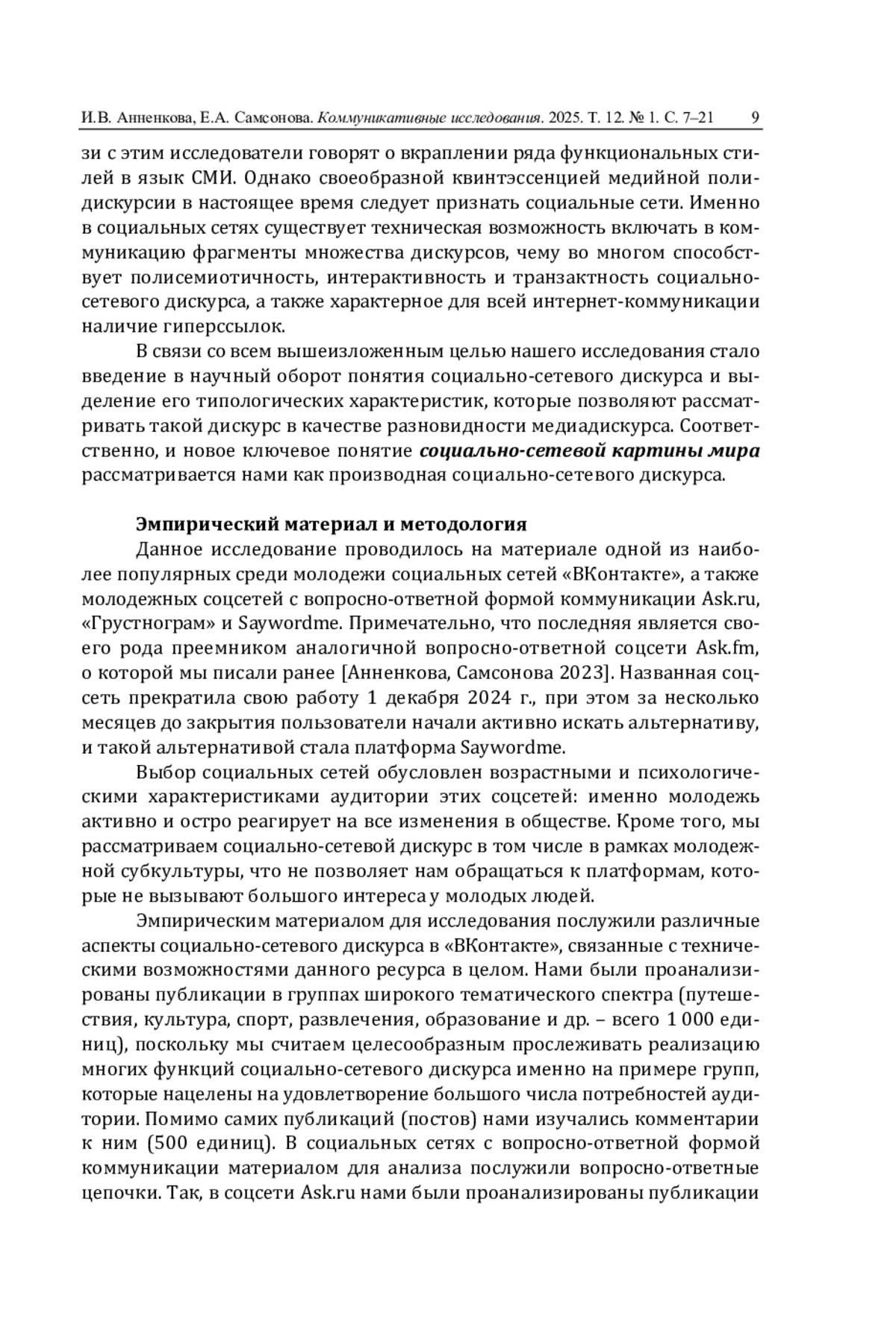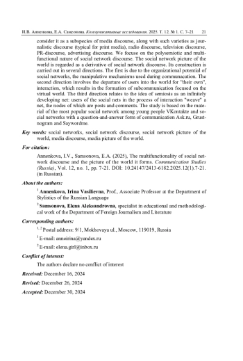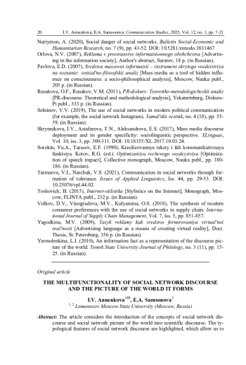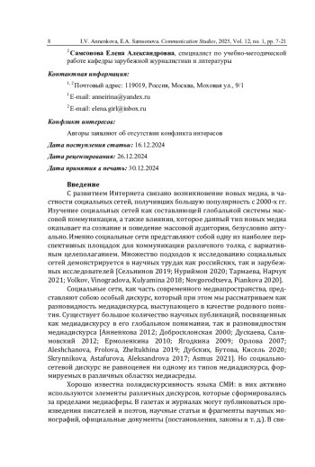 2. Анненкова И.В., Самсонова Е.А. Функции социально-сетевого дискурса и социально-сетевая картина мира (на примере молодежного сегмента новых медиа) // Меди@льманах. 2023. № 2 (115). С. 18-26. EDN: EZSHXH