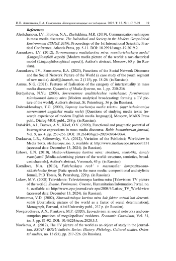 22. Aleshchanova I.V., Frolova N.A., Zheltukhina M.R. Communication techniques in mass media discourse // The Individual and Society in the Modern Geopolitical Environment (ISMGE 2019): Proceedings of the 1st International Scientific Practical Conference. Atlantis Press, 2019. P. 5-11. DOI: 10.2991/ismge-19.2019.2 EDN: WZYLJS