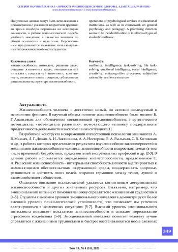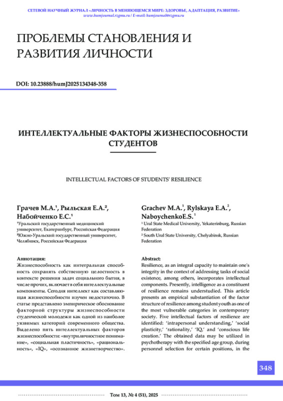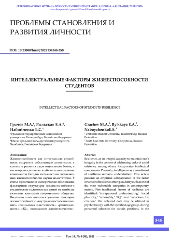 Жизнеспособность как интегральная способность сохранять собственную целостность в контексте решения задач социального бытия, в числе прочих, включает в себя интеллектуальные компоненты. Сегодня интеллект как составляющая жизнеспособности изучен недостаточно. В статье представлено эмпирическое обоснование факторной структуры жизнеспособности студенческой молодежи как одной из наиболее уязвимых категорий современного общества. Выделено пять интеллектуальных факторов жизнеспособности: «внутриличностное понимание», «социальная пластичность», «рациональность», «IQ», «осознанное жизнетворчество». Полученные данные могут быть использованы в психотерапии с указанной возрастной группой, во время подбора персонала на некоторые должности, в работе психологической службы учебного заведения, а также на занятиях по общей психологии и педагогике. Перспективным представляется выявление интеллектуальных типов жизнеспособности студентов.