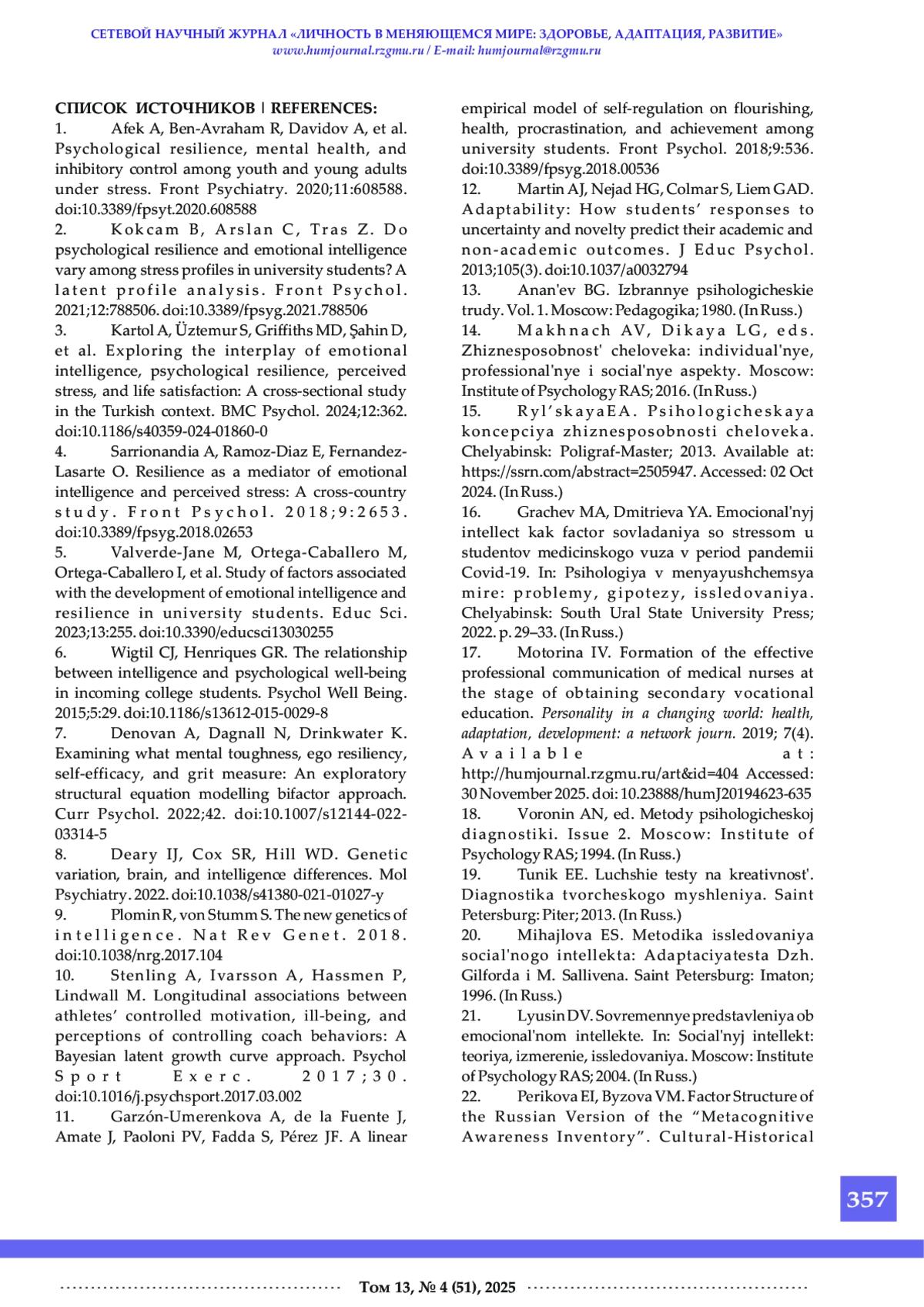 3. Kartol A., Uztemur S., Griffiths MD, §ahin D., et al. Exploring the interplay of emotional intelligence, psychological resilience, perceived stress, and life satisfaction: A cross-sectional study in the Turkish context. BMC Psychol. 2024;12:362. DOI: 10.1186/s40359-024-01860-0